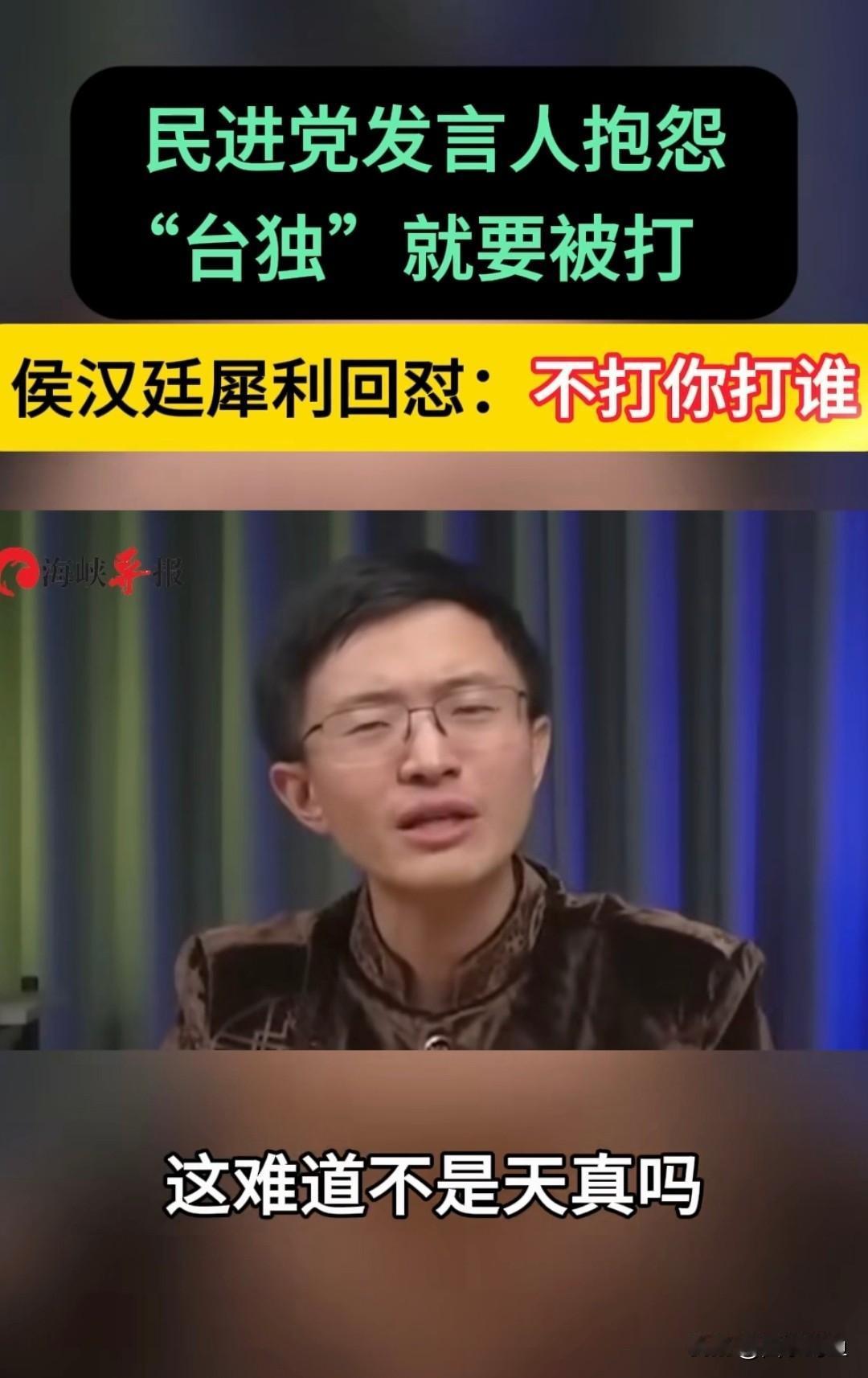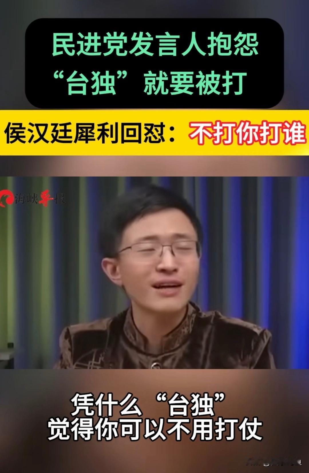 不打你打谁?脑子被驴踢了才能讲出这种话! 这人是民进党的发言人吴峥,竟然公开承认自己是台独分子,还说“自己是台独就该被打吗?如果有一天被炸死就活该吗”。 侯汉廷犀利回复:不打你打谁?难道你在幻想着“和平独立吗”? 如果台独分子都是这种智商,能冠冕堂皇的讲出这种小儿之言,那还是回家吃奶吧,别到时候死了都没人收尸。