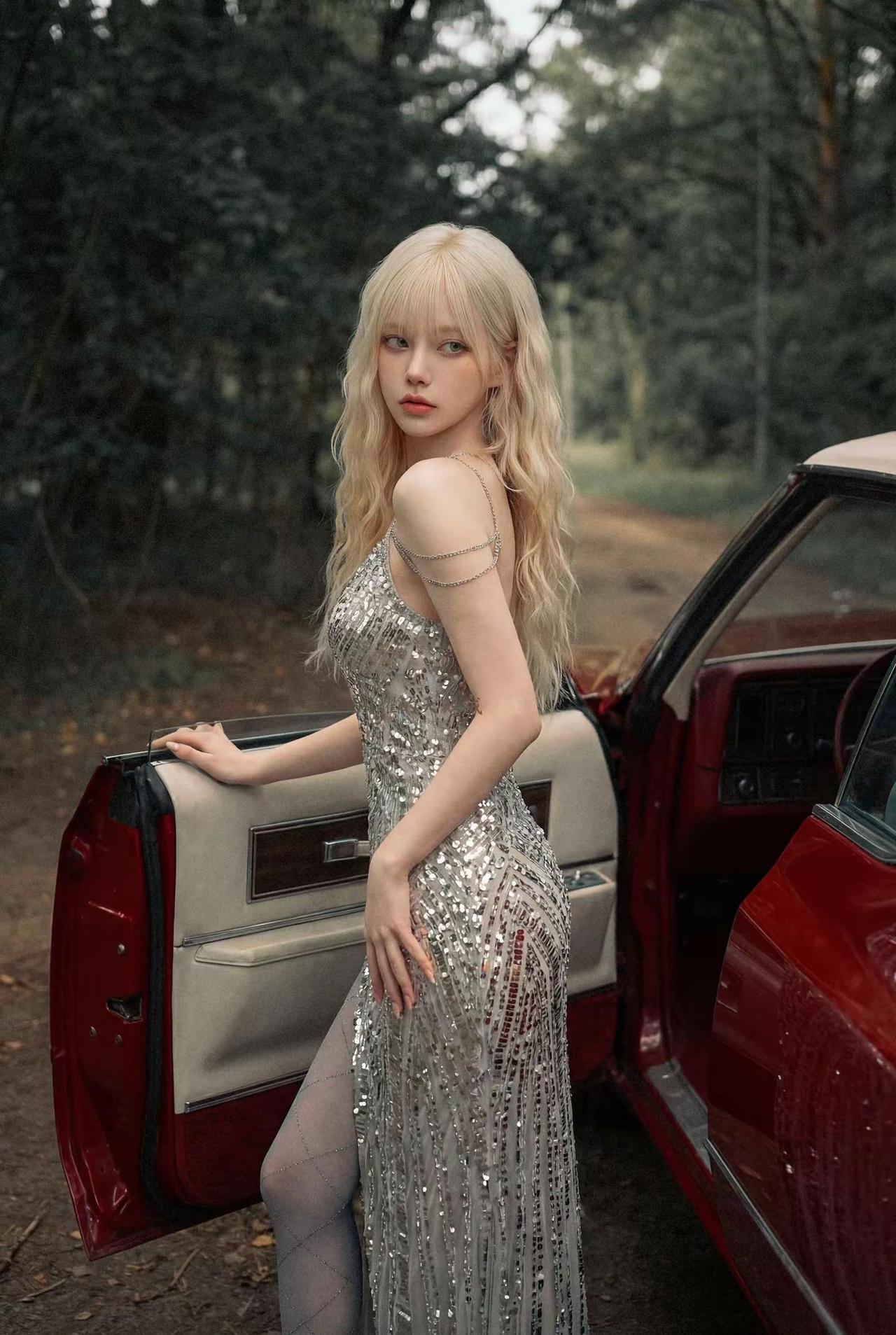 复古。复古车与时尚大片 银色连衣裙 美女 金发碧眼