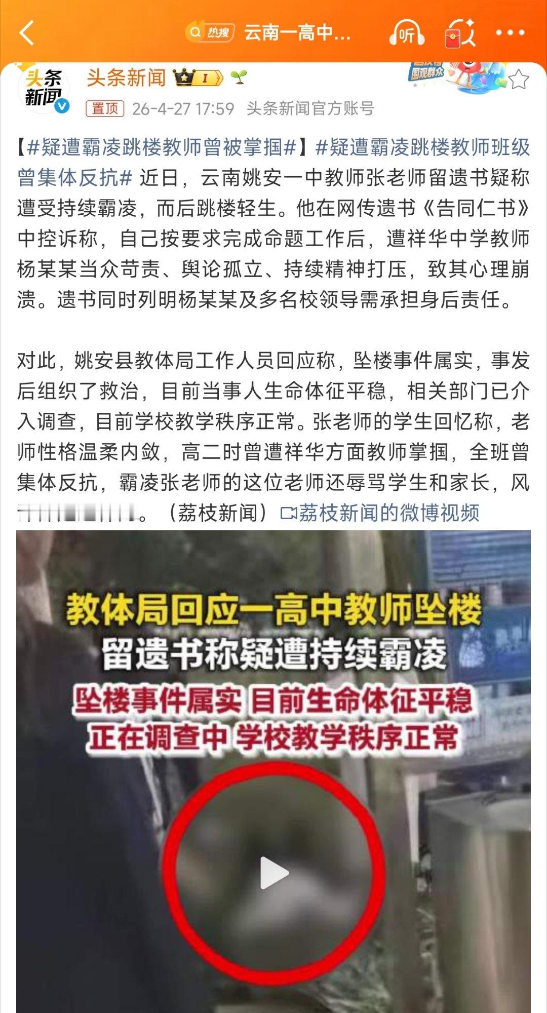 【云南姚安一中疑遭霸凌跳楼教师班级曾集体反抗】身为教师,尚且被校园霸凌。那学生处境,可想而知!霸凌者,是如何在学校教学,并为人师表的?校长的领导责任少不了。
