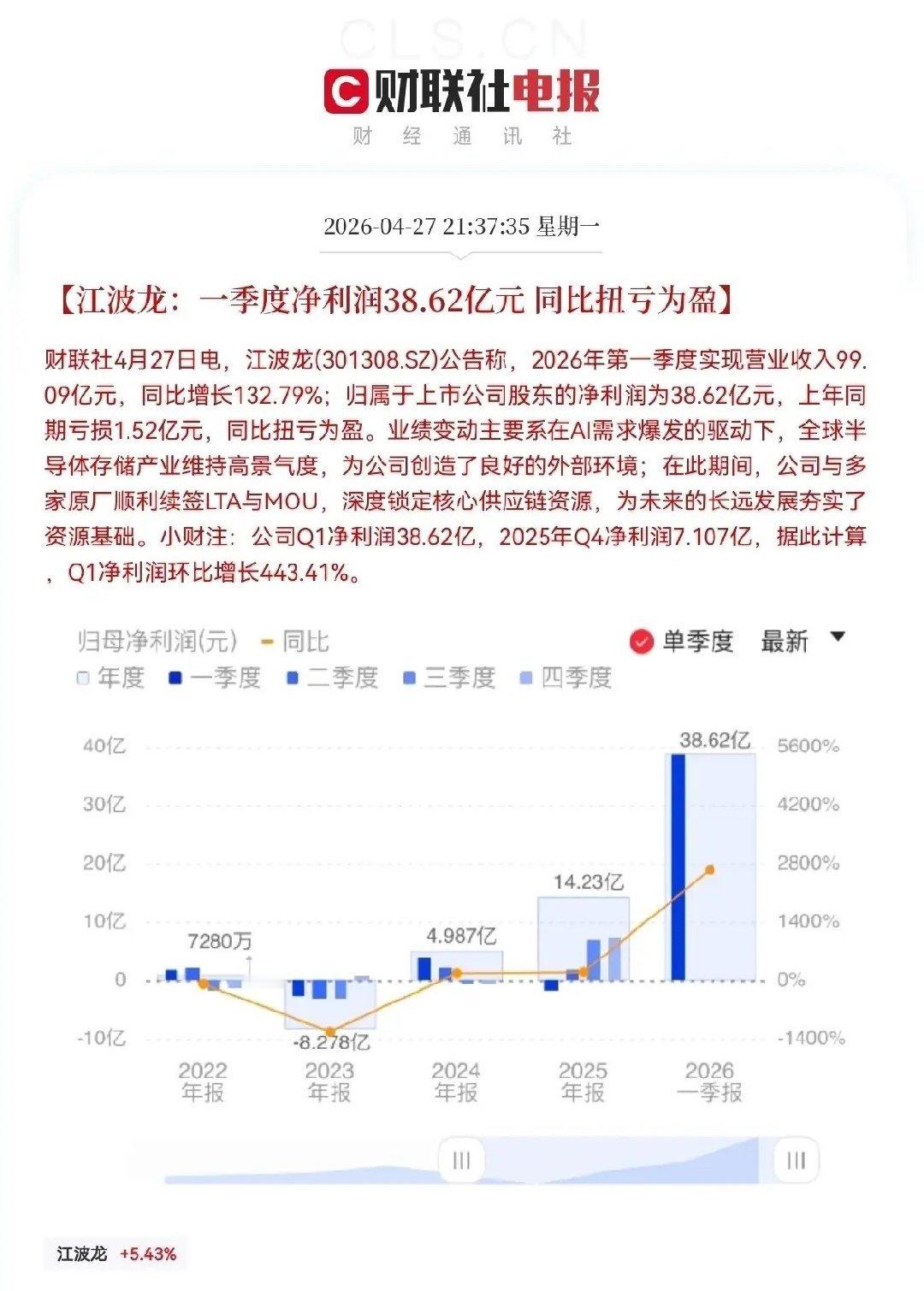 利好消息!半导体芯片产业又要中大阳线了,恭喜满仓的股民们,又是大碗喝酒大口吃肉的时候了…昨夜,芯片产业链多家核心公司扎堆披露2026年一季报,业绩集体炸裂,堪称史上最强一季报,江波龙一季度利润暴增26.44倍,中微公司一季度大增197%,紫光国微一季度大增180%,中电港大增87.38%,澜起科技大增61.3%等,这波业绩爆发绝非偶然,而是AI算力爆发、存储超级周期、国产替代深化三重共振的结果,这么好的业绩,这么好的趋势,叠加昨夜凌晨,美股那边,英伟达大涨4%,再创历史新高,闪迪大涨超8%,美光科技涨超5%,天时地利人和,恐怕今日芯片板块不涨都难了不出意外的话,今日半导体芯片板块有望继续起飞了,也要创历史新高了…