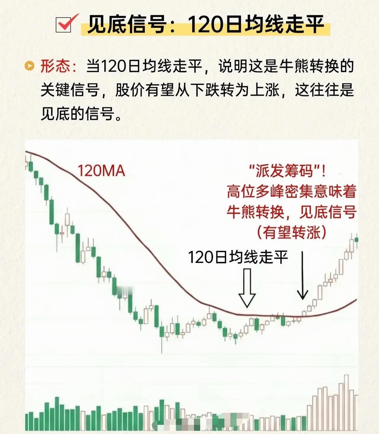 形态特征:当120日均线(120MA,半年线)走平时,这通常是牛熊趋势转换的关键临界点。结合筹码分布观察,若低位筹码密集(而非高位派发),则意味着空头力量衰竭,股价有望结束下跌周期转入上升趋势,是重要的战略性底部信号。