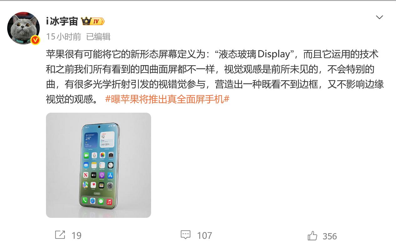 安卓玩烂了的四曲面屏,苹果要捡回来当宝了?[灵光一闪]家人们!苹果20周年版iPhone的猛料来了!4月27号,知名博主@i冰宇宙 放瓜,这款纪念机的四曲面设计,跟咱们平时见的友商机型完全不一样,主打一个视觉暴击! 重点来了!它不玩夸张的大曲率,而是靠光学折射搞事情,能营造出“看不到边框,还不影响边缘显示”的神奇效果,说白了就是物理级别的“液态玻璃”,拿在手里像一块会发光的琉璃,颜值直接拉满✨。 而且之前就有消息说,这块四曲面屏是三星定制的,曲率很温和,不会像瀑布屏那样误触,更贴心的是,曲面部分还能显示信息、支持触控,好看又好用,这不比单纯堆参数香? 还记得2017年iPhone十周年,苹果推出iPhone X,直接取消Home键、上了全面屏,库克当时说这设计能引领十年,现在2027年正好是十年之约!外界都猜,苹果要借着20周年的机会,再搞一次行业革新,复刻当年iPhone X的传奇。 不得不说,苹果是懂搞纪念款的,不玩花里胡哨的配色,直接在设计上封神,就冲这液态玻璃效果,等到2027年发布,估计又要被抢疯!你们觉得这波革新能超越当年的iPhone X吗?