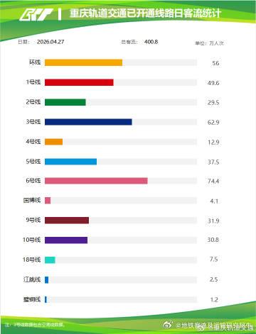【重庆轨道交通 险守400万】2026年4月27日(周一),重庆轨道交通线网客运量400.8万人次。