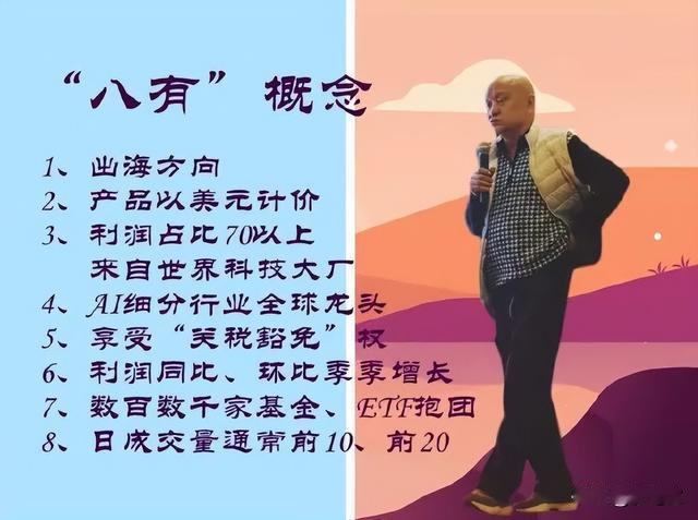 老沙选牛股,标准是“八有”: 1.出海方向; 2.产品美元计价; 3.七成利润来自世界科技大⺁; 4.AI细分行业全球龙头; 5.关税豁免; 6.利润同比环比季季增长; 7.成百上千家ETF抱团持有; 8.日成交常常前10前20。 我就想问:这样的牛股大A有莫有?