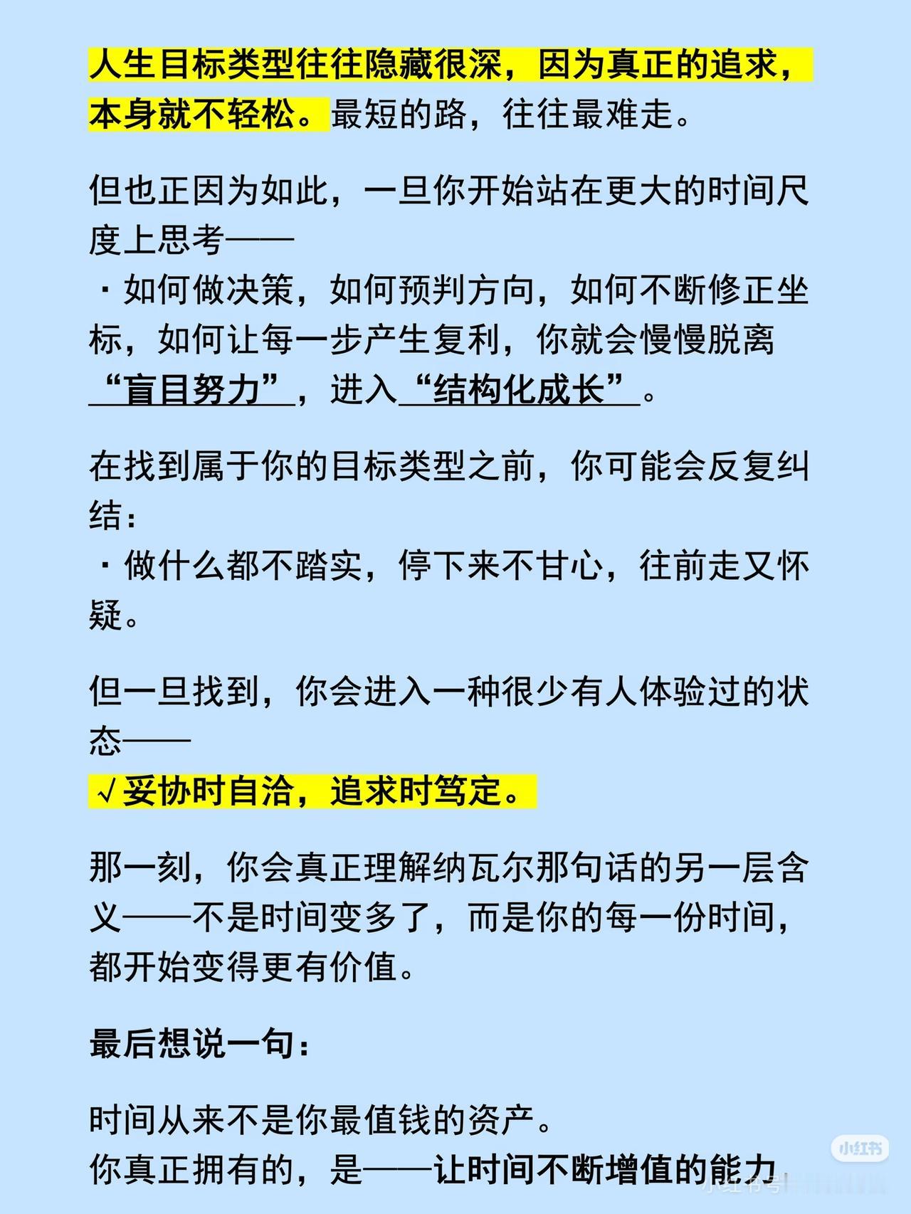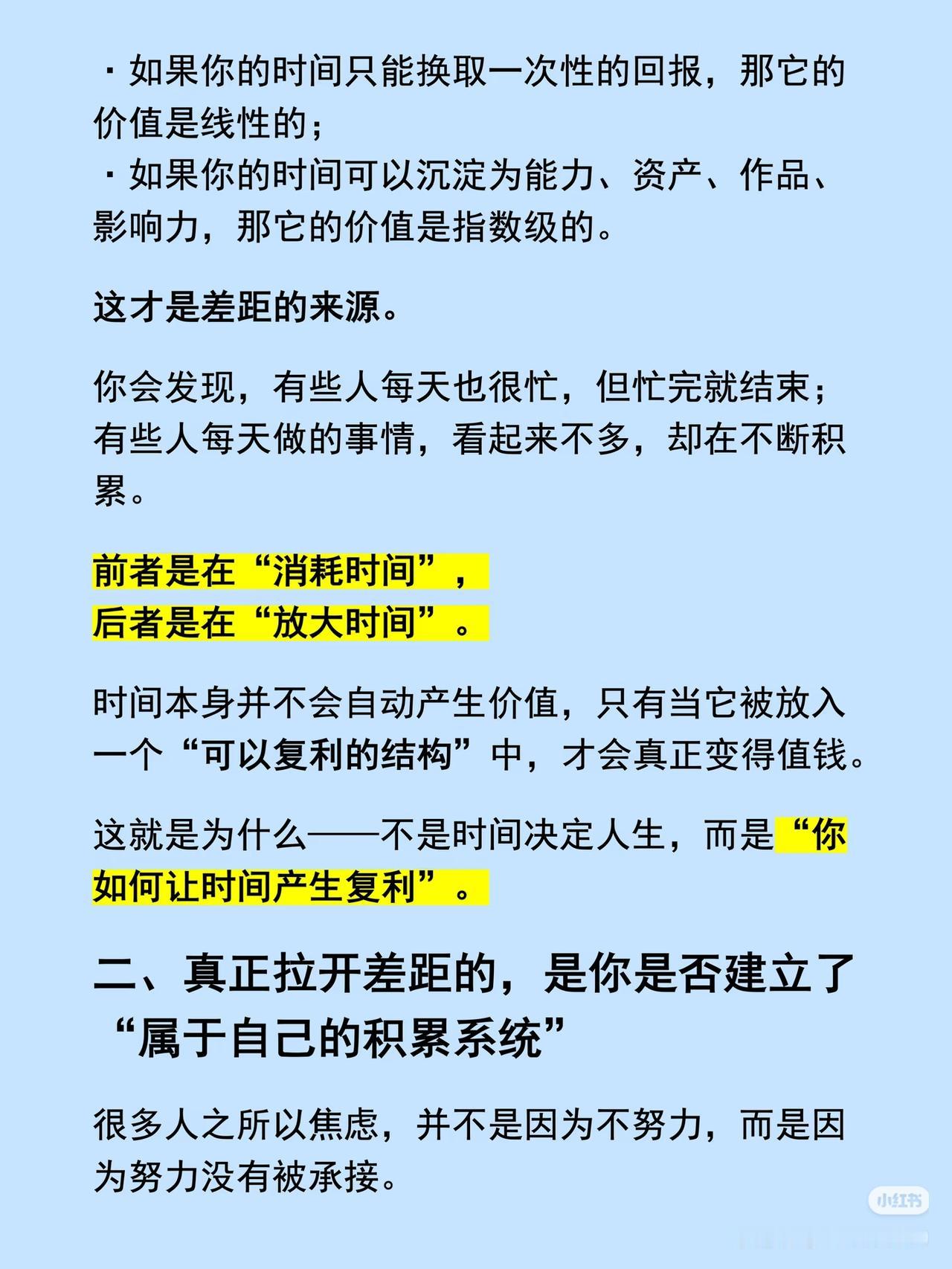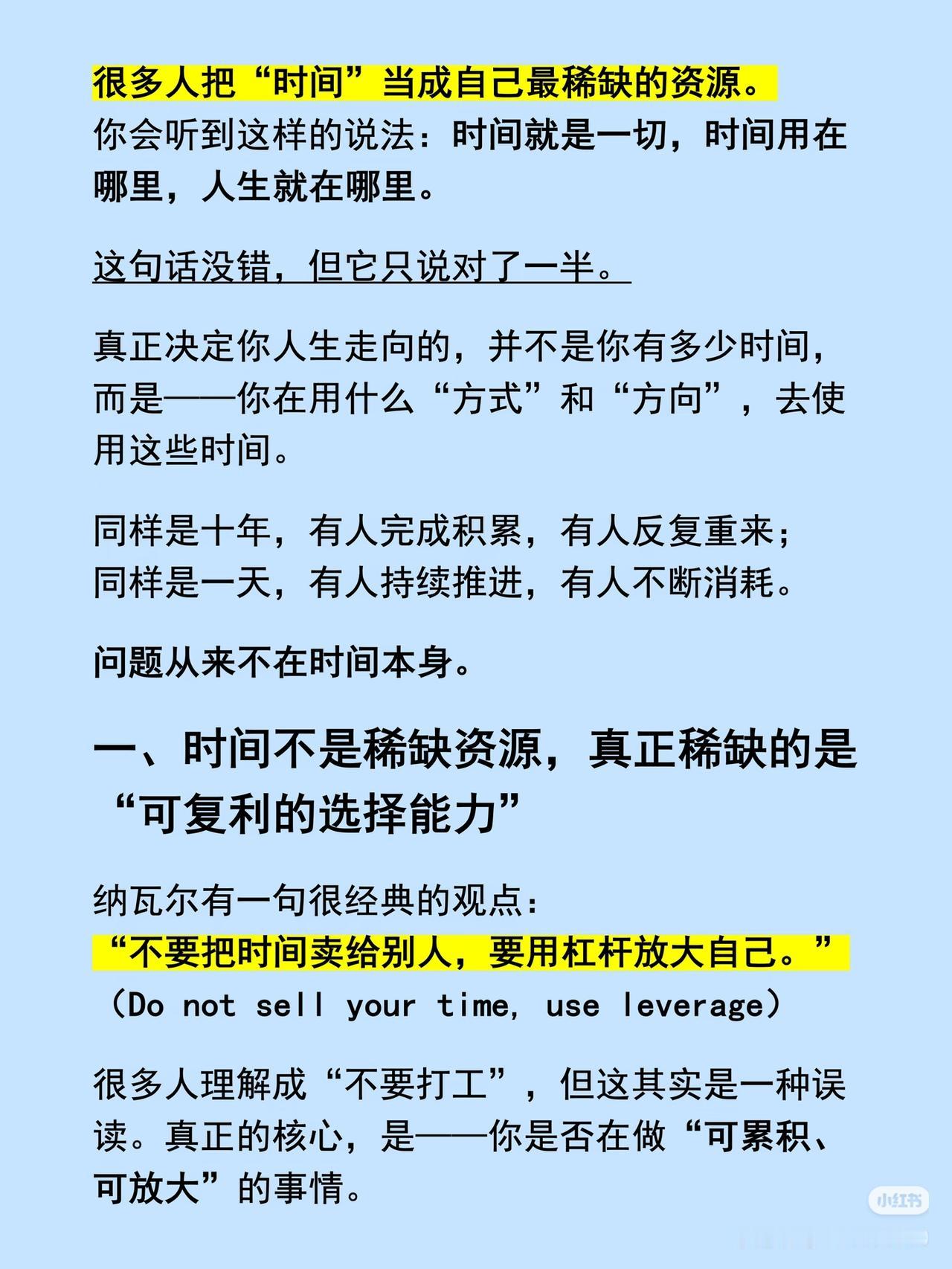 纳瓦尔的投资真相:真正值钱的,从来不是你的时间 纳瓦尔说:“不要把时间卖给别人,要用杠杆放大自己。” 很多人以为,投资就是花时间盯盘、频繁交易,结果忙了几年,账户却没什么起色。他们没搞懂:时间本身不值钱,让时间产生复利的能力,才是你真正的优质资产。 ✅ 同样是10年,为什么有人靠投资实现了财富跨越,有人却反复追涨杀跌、原地踏步? 差别不在时间长短,而在你有没有建立「可复利的投资系统」: - 有人在消耗时间:追热点、听消息、频繁换股,赚的是一次性的运气钱; - 有人在放大时间:重仓优质资产、长期持有、定投指数,赚的是复利的时间钱。 ✅ 投资的本质,是把你的时间,放进一个能持续增值的结构里。 就像芒格说的:“你需要的是一张思维模型的网,而不是单点的知识。” 零散的努力没用,只有建立起属于自己的投资体系,你的每一笔投入,才会被持续放大,而不是一次性消耗。 ✅ 最后想提醒一句: 时间不是稀缺资源,可复利的选择能力才是。与其在短线交易里耗时间,不如深耕一个赛道,找到能让你的时间持续增值的优质资产。 ⚠️风险提示:本文仅为投资理念分享,不构成任何投资建议。股市有风险,投资需谨慎! 投资 价值投资 优质资产 纳瓦尔 理财 💬 你现在的投资,是在消耗时间,还是在放大时间?评论区聊聊你的看法,点赞收藏,把这份复利思维存下来!