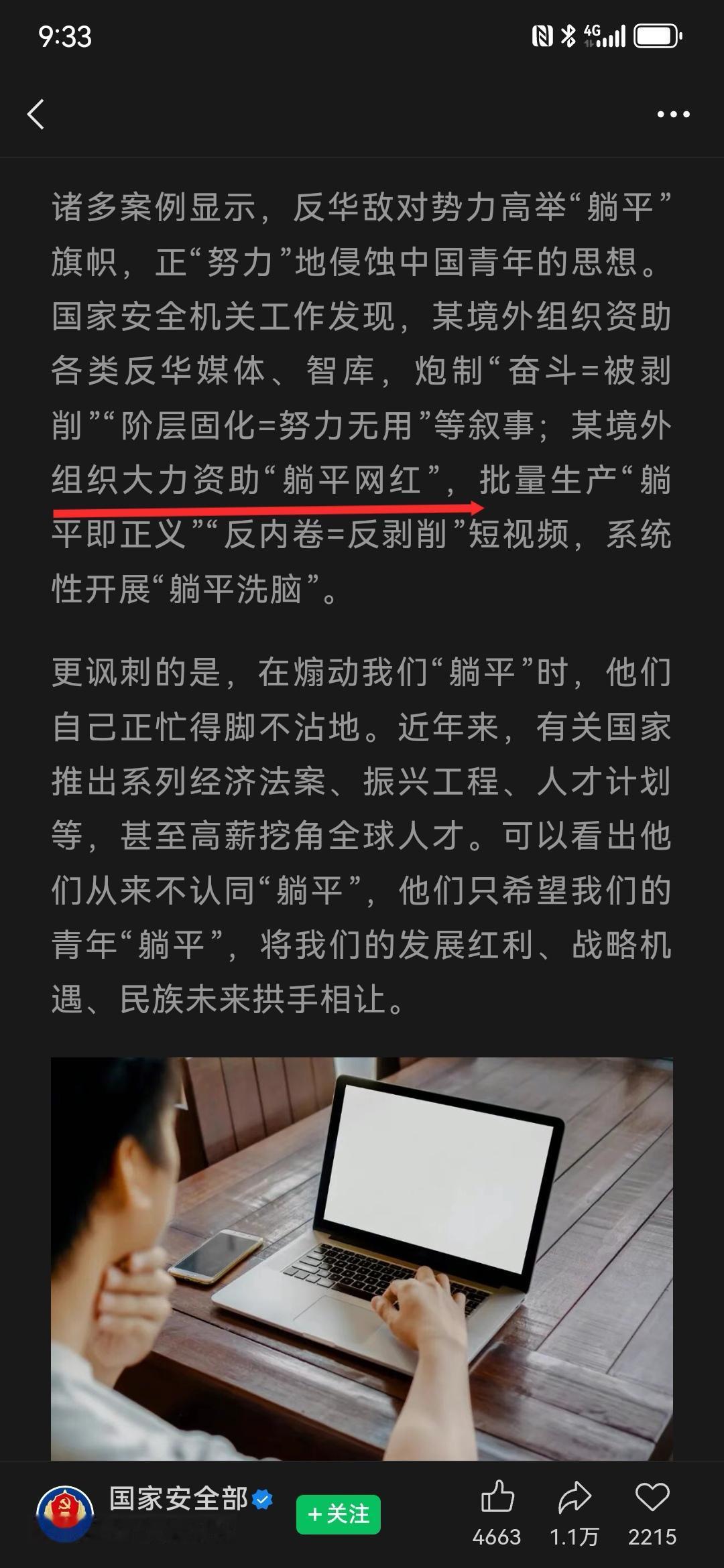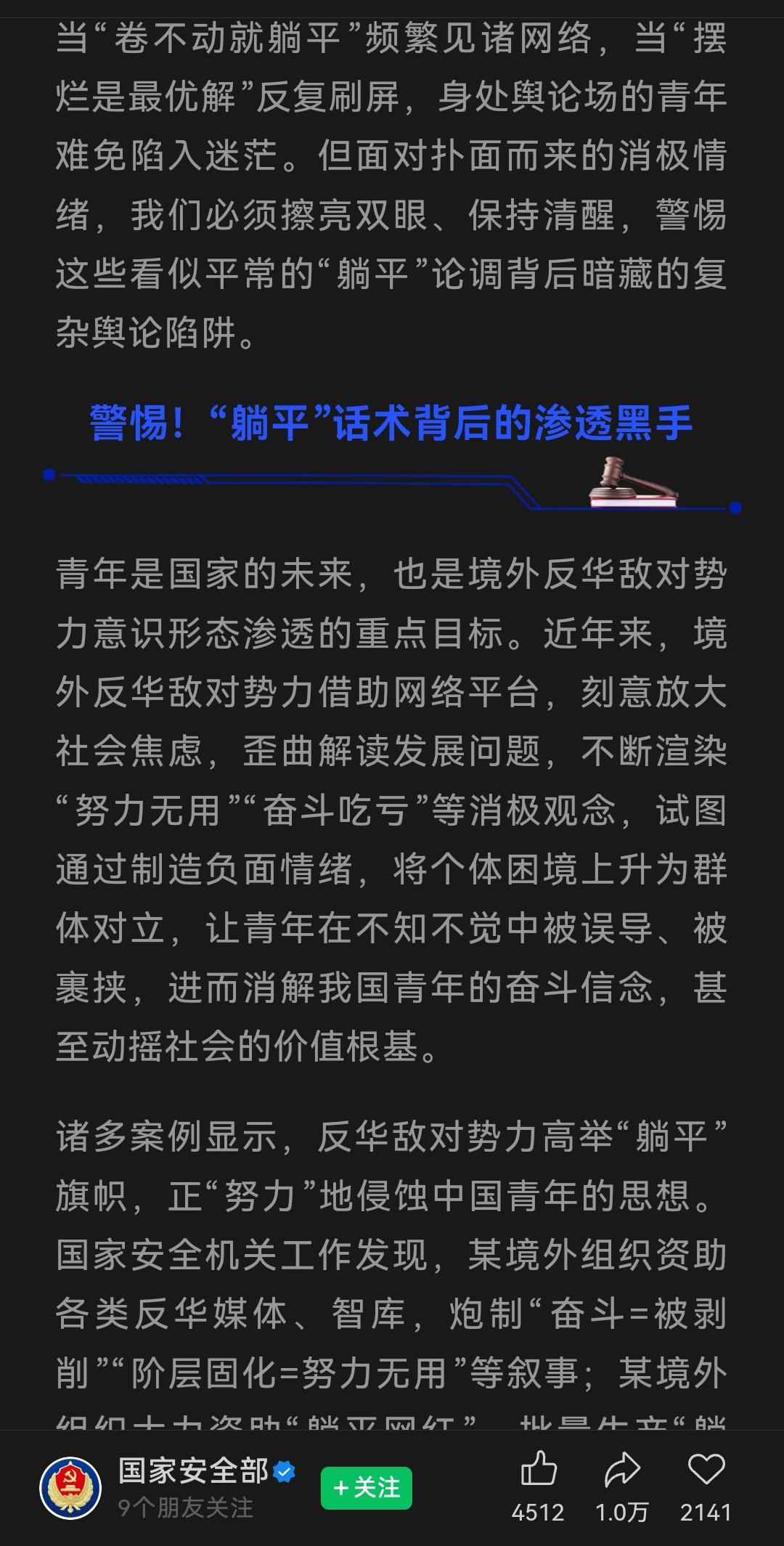 这就不奇怪了,搞半天年轻人躺平是被境外反华势力煽动的。 既然国安已经发现境外组织大力资助躺平网红了,应该进一步公布出来被大力资助的躺平网红都是哪些,以及是哪些组织资助的。 躺平网红非常可恨,我经常在一些疑似躺平网红的视频下面发评论反躺平,结果总是被围攻,关键不是有理有据的反驳,都是缺乏逻辑的低级话术重复,似乎是有组织的。 不过,我只能说疑似,不敢下定论。