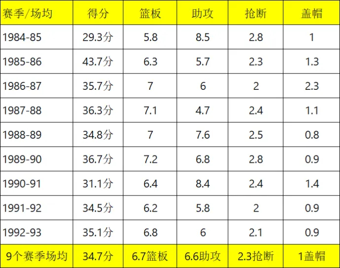 乔丹第一次退役前的季后赛场均数据什么水平?打了9个赛季,场均34.7分6.7篮板6.6助攻2.3抢断1盖帽,命中率50.1%。9个赛季中有7个单季季后赛场均得分在34.5分以上。作为对比,詹姆斯封神的18年季后赛场均34分,乔丹前九个赛季就有七个赛季比这个数据高。