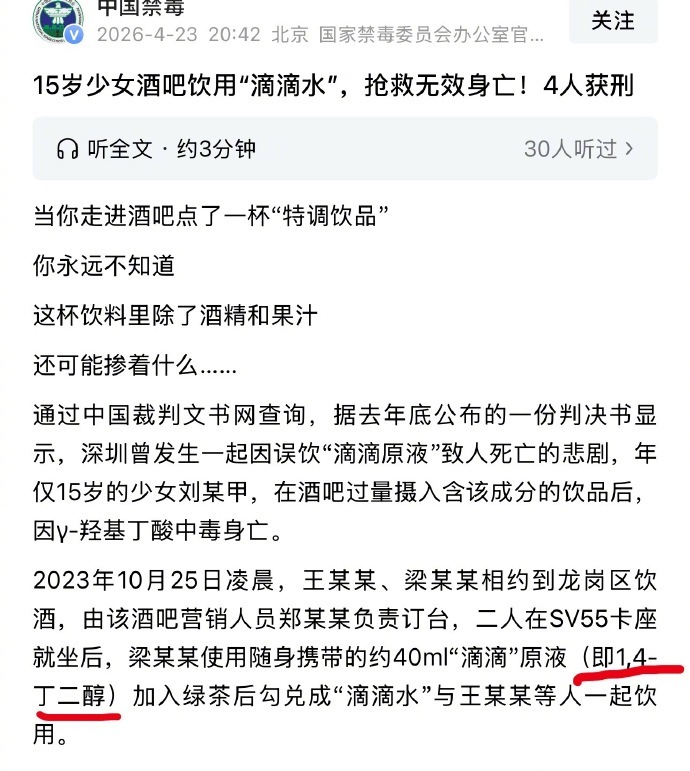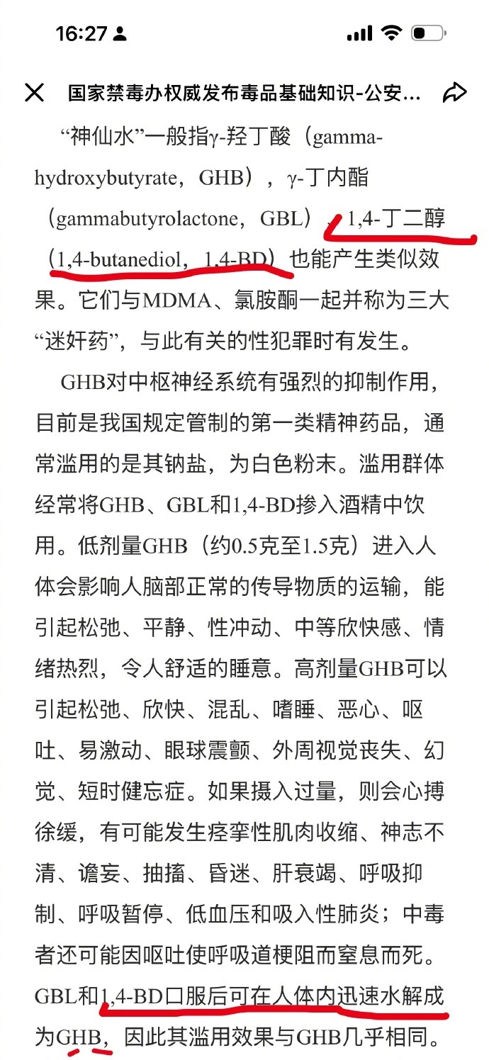 前几天我写过,在深圳某15岁女孩在酒吧被毒害的案件中,犯罪分子使用的是1,4-丁二醇,是毒品γ-羟基丁酸的直接前体,所以也是国家禁毒办专门点名的危险物质。