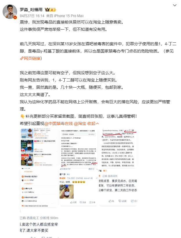 我之前觉得这里可能有空子,但我没想到空子这么大。刚有网友告诉我,1,4-丁二醇可以在淘宝上随便买到。我一查,居然真的是。几十块一大瓶,随便买,包邮到家。这太太太离谱了。我认为这种化学药品不能在网络上公开贩售,会有巨大的潜在风险,应该更加严格管理。👇补充更新部分买家留言截图,简直明目张胆,这事儿真得管啊!希望引起重视。#淘宝 毒品直接前体#(南方日报)