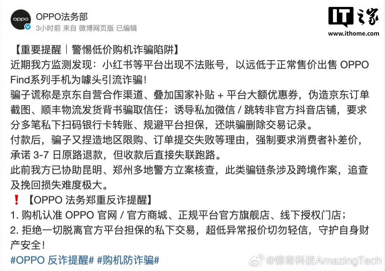OPPO法务部提醒警惕低价购机诈骗OPPO法务部发布官方提示,提醒消费者警惕低价购机骗局,切勿进行脱离官方平台担保的私下交易,谨防财产受损。(IT之家)