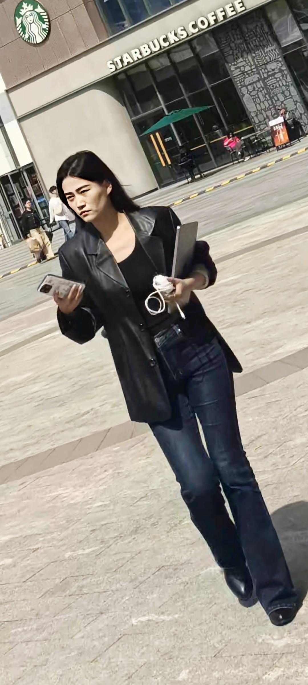 毛晓彤街拍,深色系穿搭好酷!黑色廓形外套松弛又利落,叠穿条纹T恤添了几分复古