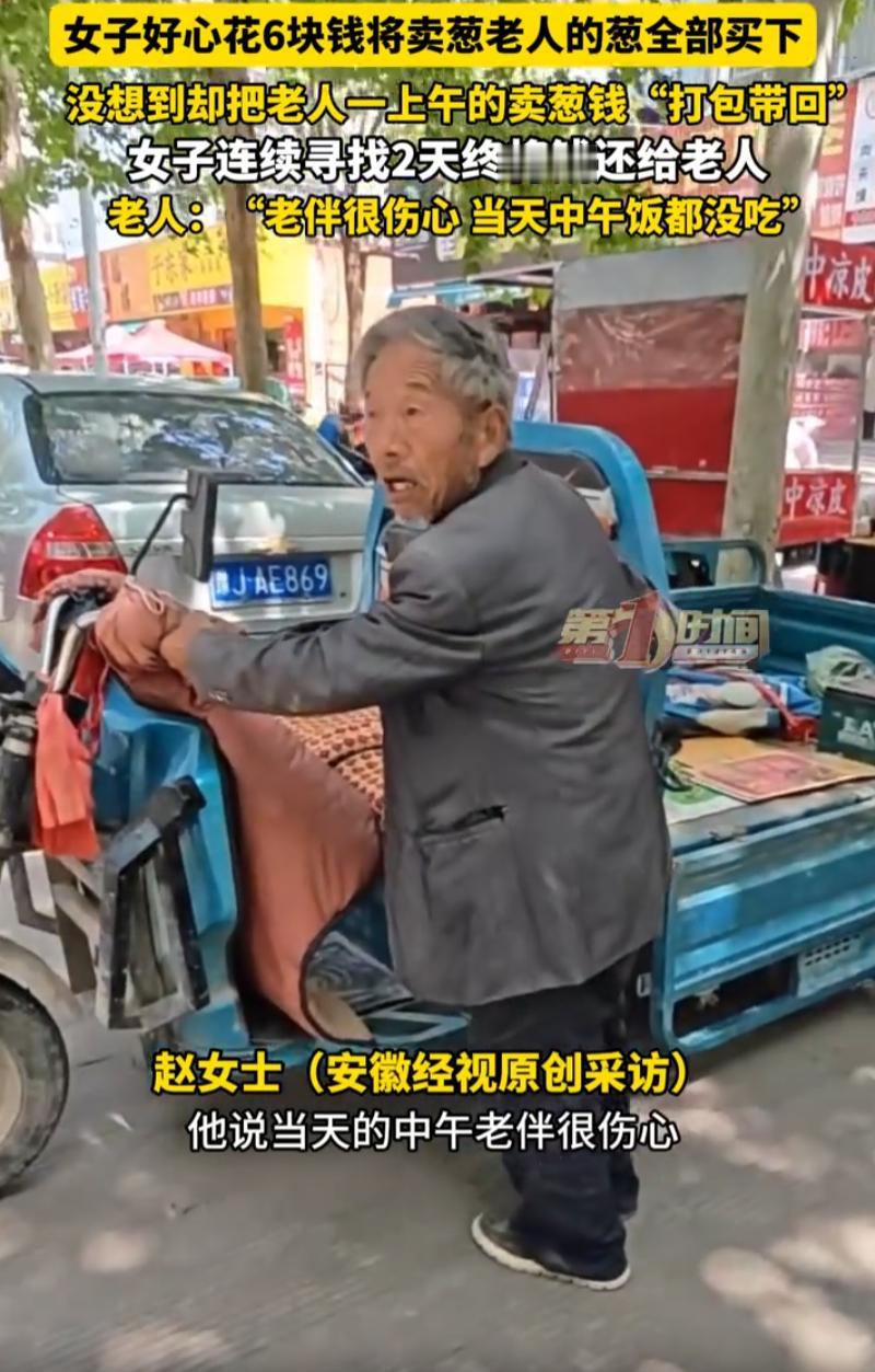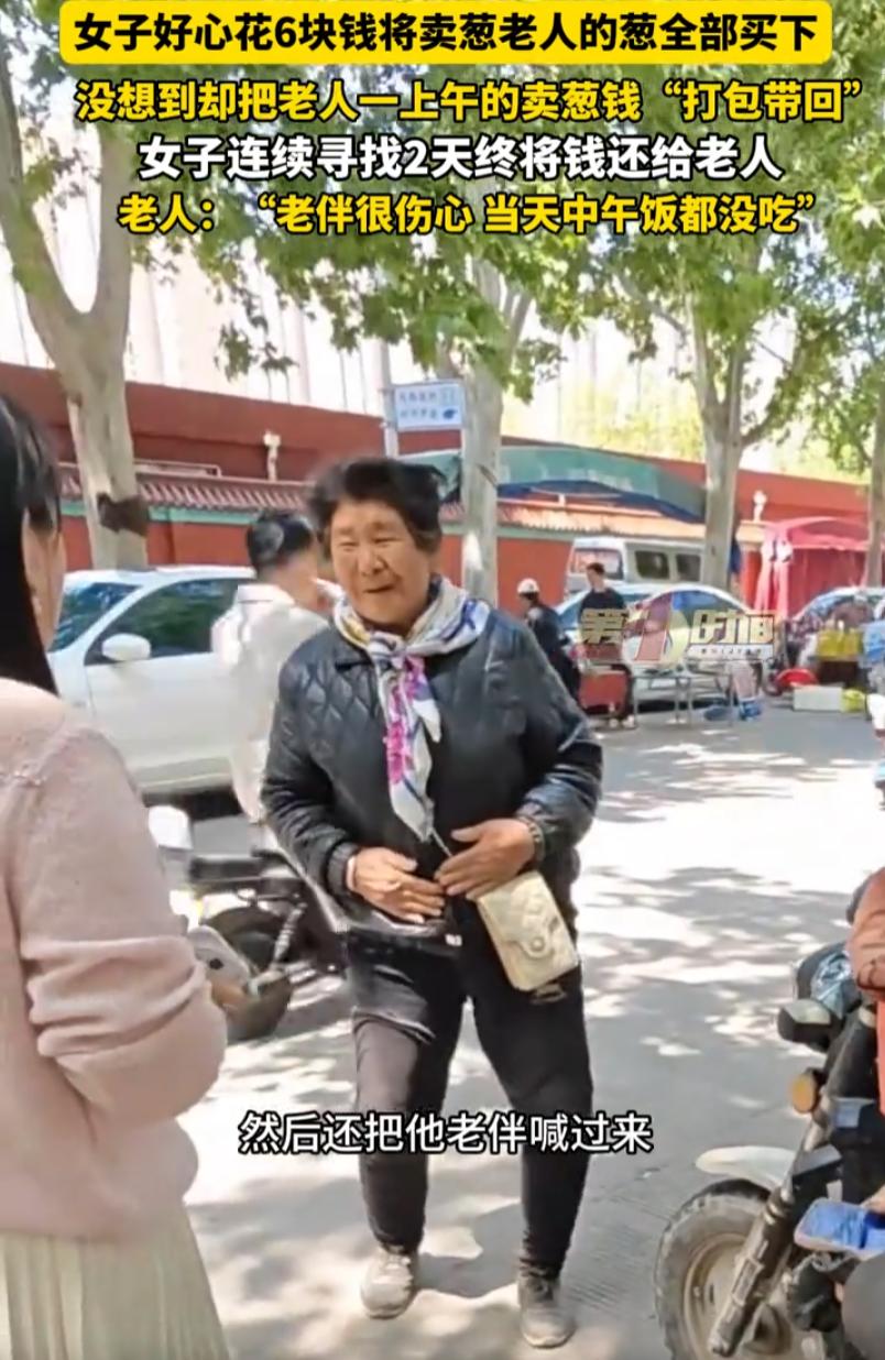 差点好心办坏事!河南濮阳,女子发现一名老人在街上摆摊,随后花6块钱把老人的葱都给包圆了,可回到家一打开,发现里面有22块钱,原来老人摆摊一天的钱也被她一起打包回来了,女子找了两天,终于把钱还回去了,老人说:当时老伴知道钱不见了午饭都没吃 当天,赵女士和丈夫正打算出门吃顿饭。车停稳当,她一眼就瞧见路边蹲着个老大爷,脚边摆着几捆葱。因为老人所在的地方不让摆摊,他当时正收拾东西准备换地方 赵女士这人,心软,看不得老人风吹日晒还卖不完东西。她没多想,走上前问了一句:这葱我全要了,多少钱? 大爷抬头,算了算,说六块 六块钱,几捆葱,赵女士痛痛快快扫码付钱,拎着袋子就走了。她觉得自己干了件小事儿——帮老人早点回家,少吹一会儿冷风 可回到家,她打开袋子一翻,愣住了 葱底下压着一卷钱,皱皱巴巴的,一张十块,两张五块,剩下都是硬币。数了数,正好二十二块 赵女士第一反应不是惊喜,而是心里猛地一沉。这钱八成是大爷卖一上午菜攒下来的,随手揣在袋子里,连葱带钱一块儿给她了。六块钱的葱,实际她等于白拿,还倒赚了十六块? 她越想越不是滋味,跟丈夫说:这钱得还 第二天,她专门又去了那条街,来来回回找,没见着大爷。第三天接着找,终于在4月23号那天,远远看到了那个熟悉的身影 大爷一听说她是来还钱的,先是愣住,随后咧嘴笑了,赶紧招呼旁边一个老太太过来——那是他老伴 老太太走过来的时候,眼圈先红了 大爷说,那天回到家发现卖菜的钱没了,老伴急得中午饭一口没吃。一方面是心疼钱,一方面是她觉得老头子在外面忙活一天,替他觉得憋屈。 赵女士把二十二块钱塞到老太太手里的时候,老太太攥着钱,嘴上不住地念:好人,好人啊 大爷在一旁乐呵呵地说,钱找到了,开心得很 这事儿传开了,有人夸赵女士讲究,有人替大爷庆幸。但我想说的是另一层意思 这二十二块钱,对很多人来说,可能就是一杯奶茶、一包烟。可对那对老夫妻来说,那是他们一整个上午风吹日晒换来的。老太太因为丢了这个数目,连午饭都吃不下去,不是因为小气,是因为在意——在意那点辛苦钱,更在意老伴那一上午的奔波就这么打了水漂 反过来看赵女士,她当初花六块钱把葱包圆,本来是一种善意的表达。出师未捷,好心差点办了坏事,但她没有一走了之,而是花了整整两天时间,硬是把这笔钱给找回去了 善良不是一个动作,而是一整套闭环系统。你起了好意,办了事,中间出了岔子,愿意花时间去弥补、去修正,这才叫真正把善事做到底