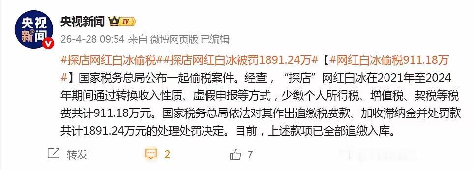 塌房!千万粉丝网红白冰偷税911万,被罚1891万,彻底凉凉! 国家税务总局重磅通报,又一位顶流网红栽了! 千万级探店博主白冰,2021年至2024年期间,通过转换收入性质、虚假申报等方式,偷逃个人所得税、增值税、契税等税费911.18万元。 最终被依法追缴税款、加收滞纳金并处罚款,合计1891.24万元,目前所有款项已全部入库。 镜头前豪车美食、烟花盛宴,风光无限;镜头后想方设法逃税,无视法律。 依法纳税是每个公民的基本义务,流量再大、粉丝再多,也不能触碰法律红线。靠偷税漏税堆砌的光鲜,终究不堪一击。 流量不是护身符,法律才是底线!这一次,真的凉透了。 白冰偷税 网红塌房 依法纳税