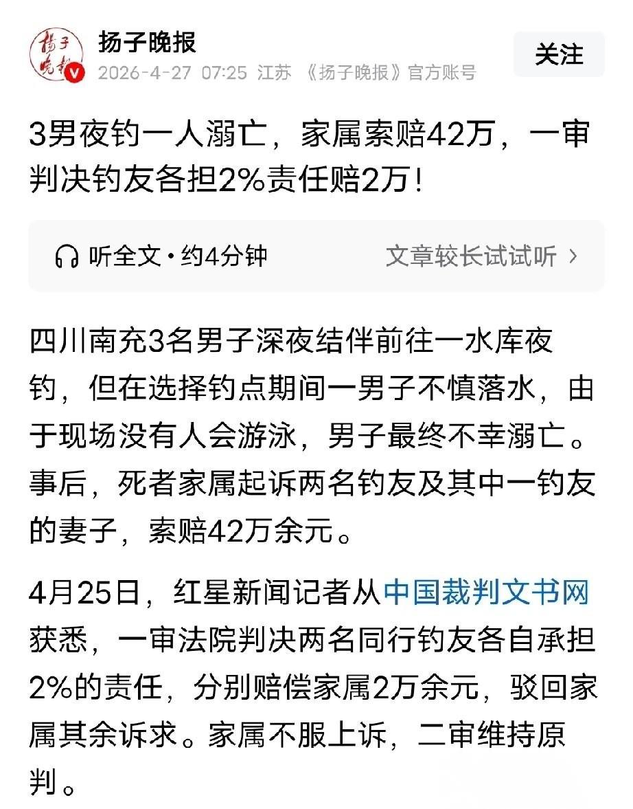 “冤不冤?”四川南充,男子10多约朋友夫妻与一钓友一起去夜钓,在寻找钓点时,男子掉进水里,朋友和钓友用鱼竿搭救未果,报了警,最终没能把人救回来。 谁成想,这桩悲剧随后演变成了一场让人心寒的官司。死者张某的家属反手就把同行的三个人全告上法庭,开口就要42万赔偿。这可真应了那句老话,“斗米恩升米仇”。 夜里十点多,水库正涨着水,四周黑灯瞎火。连小学生都知道这地方危险。 可张某是个成年人,非得撇开同伴,自己摸黑去找钓点。说难听点,这就是把命交给了运气。等出了事,同行的雷某和冉某拿着鱼竿拼命救人,打通了报警电话,连不会游泳的家属都跑出去喊人帮忙。大家能干的、该干的,全干了。 法院这笔账算得很明白:总共104万的损失,张某自己得负96%的责任。 判决最后定下来,雷某和冉某每人掏2万块。 钱确实不多。但这笔钱赔得着实让人憋屈。 家属痛失亲人,心里难受,外人都能理解。可拿着这份难受去迁怒旁人,这事儿就变味了。法律决不能给“谁死谁有理”的歪风邪气留口子。 你想想,要是朋友结伴出门,只要没把人拉住,出了意外就得按人头摊派责任。以后谁还敢跟朋友组局聚会?这种看似和稀泥的“温情判罚”,其实是在透支社会的信任底线。 人情是人情,法理是法理。 成年人做事,得自己认账。半夜往涨水的激流里走,那一刻的风险,只能自己扛。 别让好心的朋友,成了意外事故的垫背人。 对此,你怎么看?