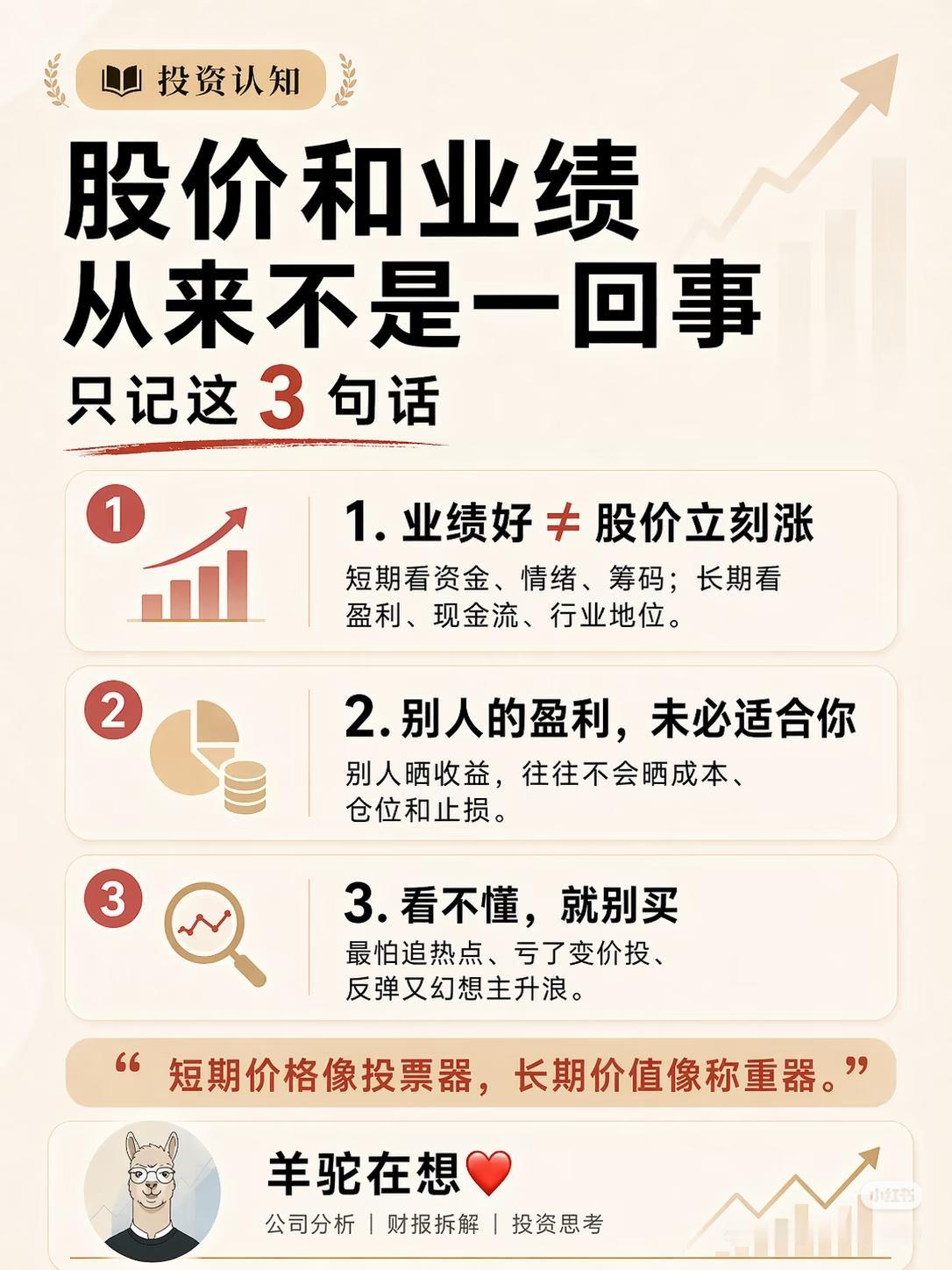 别再被骗了!股价和业绩,根本不是一回事 巴菲特说:“短期市场是投票机,长期才是称重器。” 很多人炒股,总以为业绩好=股价马上涨,结果追进去就被套牢,看完这3句话,少亏几十万👇 ✅ 1. 业绩好≠股价立刻涨 短期涨跌看资金、情绪、筹码;长期才看盈利、现金流、行业地位。别被单季财报冲昏头脑。 ✅ 2. 别人的盈利,未必适合你 别人晒收益,不会晒成本、仓位和止损线。跟风追高,大概率就是你接盘。 ✅ 3. 看不懂,就别买 最怕追热点亏了变价投,反弹又幻想主升浪。不懂的标的,永远别碰。 ⚠️风险提示:本文仅为投资理念分享,不构成任何投资建议。股市有风险,入市需谨慎! 投资 股票 价值投资 股民 理财 💬 你有没有踩过“业绩好股价不涨”的坑?评论区聊聊你的经历,点赞收藏,别再被市场骗了!