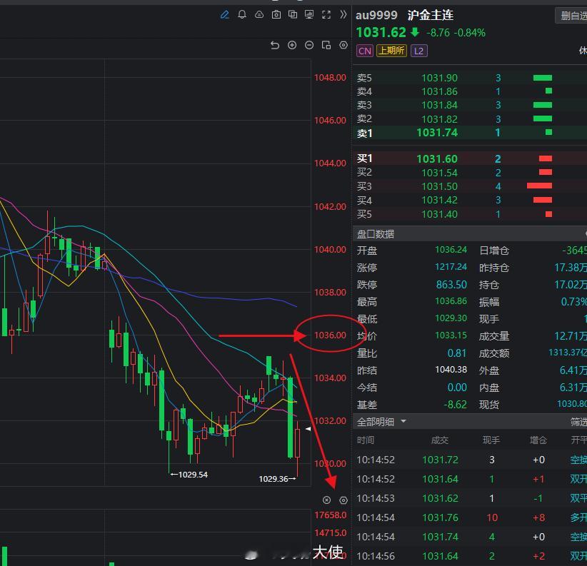 黄金早上讲到重点关注1036附近压力不破就要下来,是不是下来了,不可追,只能等反弹空!