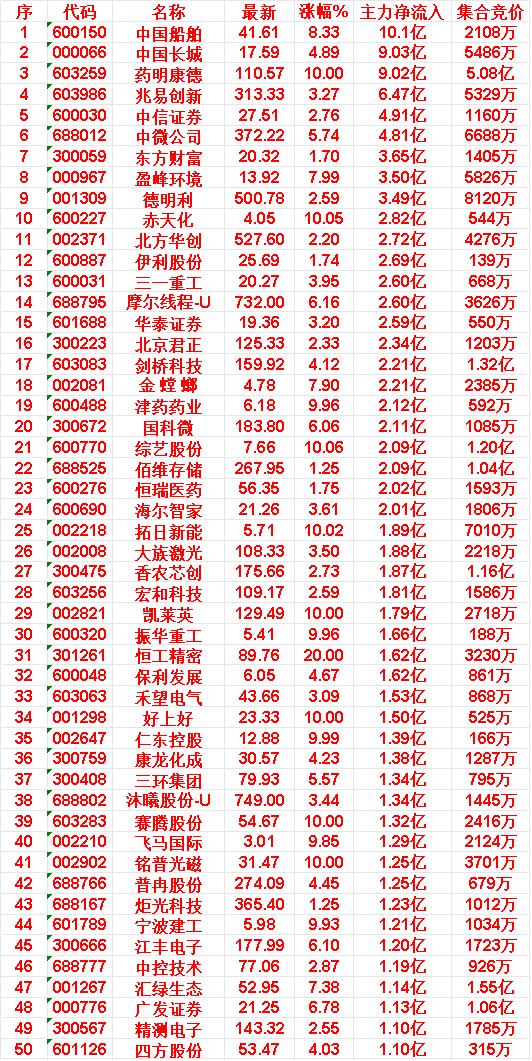 4月28日开盘45分钟,主力资金“买入的 ”的50名单一览! 中国船舶 最新股价:41.61元 主力净流入:10.1亿元 中国长城 最新股价:17.59元 主力净流入:9.03亿元 药明康德 最新股价:110.57元 主力净流入:9.02亿元 兆易创新 最新股价:313.33元 主力净流入:6.47亿元 中信证券 最新股价:27.51元 主力净流入:4.91亿元