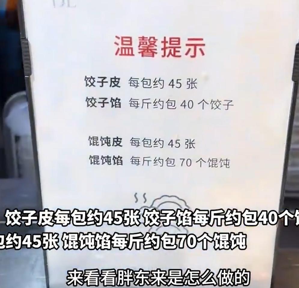 近日,胖东来多款自营产品被顾客抢购,18元一箱的饮用天然矿泉水被抢空,新乡胖东来工作人员告诉记者,三家店都没货了。 记者注意到,除了矿泉水,胖东来的“DL”饺子皮被网友夸赞:“你能想到的,或者是你想不到的,胖东来都帮你想到了。”饺子皮包装上显示,该产品为生湿面制品,净含量为360g,一旁的“温馨提示”牌上写着:饺子皮,每包约45张,饺子馅,每斤约包40个饺子;馄饨皮,每包约45张,馄饨馅,每斤约包70个馄饨这样的提示,被网友点赞。(大象新闻)