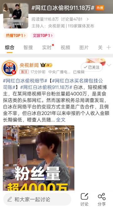 又一个网红栽了!追缴税1800多万! 拥有4000万粉丝的短视频博主白冰,是美食探店类的头部网红。这样粉丝量级的网红,收入肯定不低,奇怪的是,他申报的个人收入金额长期偏低,这引起了税务部门注意。 现在的短视频行业,可以说是普通人翻身最快的赛道。 这几年,一大批探店、测评、生活分享类网红顺势崛起,靠着日积月累的内容输出,攒下庞大的粉丝基数,也拿到了远超普通上班族的收入。 但红利爆棚的同时,行业翻车事件也层出不穷,其中最常见、代价最大的,就是税务问题。 当下,美食赛道尤其内卷,除了风格不一的大胃王,就是各种夺眼球的奇葩食材,想要独树一帜并不容易。 白冰主打高端餐饮、私人会所、特色轻奢餐厅探店,专注测评大众平时很少接触、难以消费的高端美食。 他没有浮夸台词,只是安安静静沉浸式体验美食、讲解口感和菜品特色。 接地气又不炫富的风格,让他积累了大批量忠实粉丝,也成为高端餐饮品牌最青睐的合作网红之一。 大部分人只知道网红赚钱,却不知道头部博主的变现渠道有多丰富。 门店推广、品牌广告植入、短视频定制测评、直播带货、品牌联名,各式各样的商业订单源源不断。 按照行业公开报价,这类顶流博主单条推广报价动辄数万甚至十几万。 也正是因为收入透明、流量可视化,头部网红一直是税务部门的重点监控对象。 大数据系统会自动抓取短视频平台的公开数据,包括账号热度、更新频率、商业合作次数、粉丝体量,同时对接第三方收款平台、银行流水、资产登记信息。 简单来说,网红接了多少广告、赚了多少钱、名下有哪些资产,系统里一目了然。 就是在这样全方位的监控下,白冰多年以来上报的个人收入数据,和他真实的商业体量严重不匹配,数据漏洞直接触发税务预警,开启了专项稽查。 四年时间里,他并不是单次疏忽漏税,而是长期通过多种网红圈内流行的方式规避纳税,手段多样且隐蔽。 其中,注册个体户和空壳公司,是圈内最普遍的避税方式。 为了少交钱,很多网红都会私下注册多家个体工商户,不实际办公、不雇佣员工,仅仅用来对接商业订单、结算收款。 在实际操作里,很多网红都会把自己的私人购物、出行旅游、奢侈品消费、家庭日常开销等全部打包计入公司运营成本。 更值得关注的是,白冰的涉税问题不止局限于线上的短视频商业收入,就连线下的个人房产交易也存在报税不实的情况。 线上变现、线下资产交易双双出现税务漏洞,也足以证明,这并不是一时疏忽,而是长期存在、刻意为之的偷税行为,贯穿了账号流量爆发后的整个盈利周期。 最近几年,网红涉税翻车的新闻层出不穷,覆盖美妆、美食、娱乐、带货、生活测评等几乎所有自媒体赛道。 很多创作者误以为,只要注册了公司,走对公账户做账,所有操作就是合规合法的,根本意识不到自己正在触碰法律红线,全程抱着侥幸心理。 其实国家给到小微企业的税收优惠,初衷是扶持实体创业、帮助正经经营的小微企业降低运营压力,并不是给高收入网红用来避税的工具。 监管部门对自媒体行业的整治从未停止,专门针对网红、主播等高收入灵活就业群体的稽查力度持续加大,彻底压缩了行业的灰色操作空间。 不管粉丝多少、名气多大、热度多高,只要存在涉税违规,都会被精准排查。 对于这件事,您有什么想说的吗?欢迎评论区留言讨论。 信息来源:央视新闻 2026-4-28