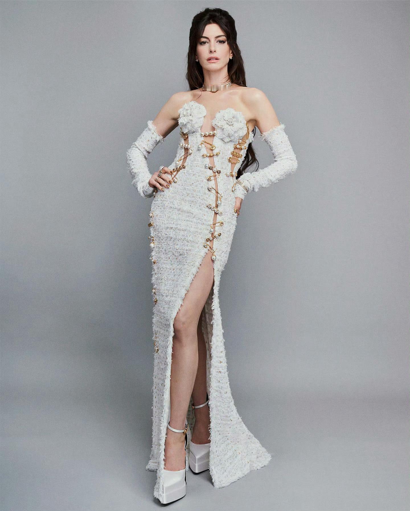 这张封面也是一张未完成的作品。正式的刊物出版打印时需要打孔,用安妮·海瑟薇在MetGala上身的Versace高定礼服上的黄金曲别针穿过蝴蝶结,把这团线串联起来。这是过去和现在的链接,是上世纪蓝色诞生之初与现在时尚的交合,是过去黄金时代和当今的链接 。 Versace如今也属于Prada,安妮·海瑟薇和Versace也有特别多的缘分。