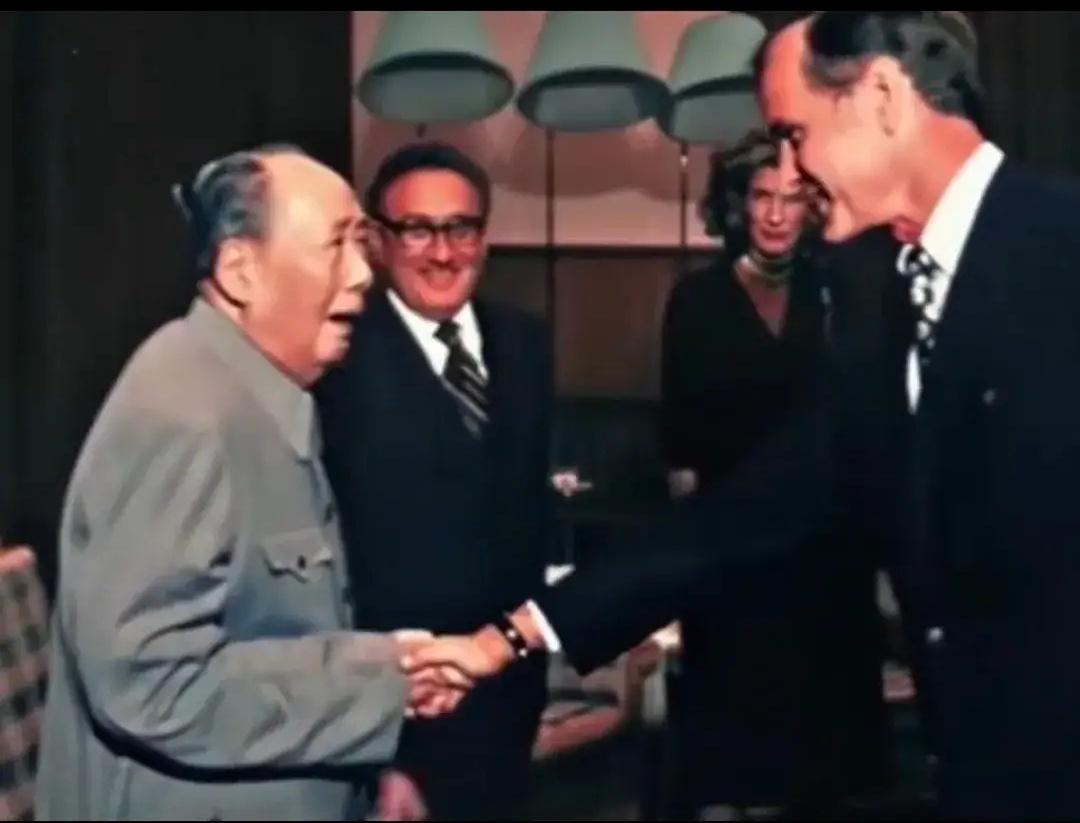 80岁的毛主席看不清老布什的脸,把他拉到眼前说:这个年轻人能当总统。 1975年,毛主席的身体大不如前,就连站着都很吃力,眼睛也因为白内障看东西模糊。这一时期他已经看不清字了,很多文件和书籍需要工作人员念给他听。这丝毫不影响他的思维、他的睿智、他的幽默。 这年10月,基辛格带着刚结婚不久的妻子南希来到中国,随行的还有当时担任美驻华联络处主任的老布什。毛主席接见他们时,因为看不清,特意把老布什拉到了跟前,仔细打量了一会儿,笑着说:“这个年轻人能当总统!”毛主席为什么把老布什拉到面前看?还说他将来能当总统。这就是老人家的过人之处,他总能看到我们看不到的事物。美记者、作家卡尔森:称毛主席是“一位走在时代前面50年的天才”。 当时老布什只是美驻华联络处的主任,在很多人眼里,他距离总统的位置还很远。可毛主席就凭着这一眼,给出了这样的判断。老布什当时听了,既惊讶又礼貌地弯下腰和毛主席握手,这个动作做得自然又恭敬。 在场的人都能感觉到,不管面对谁,毛主席身上都有一种无形的力量,能让人不自觉地被他的气场感染。后来毛主席的警卫回忆说,很多外国元首见到毛主席,都会不自觉地紧张,因为他的眼睛像能看穿人心里的想法一样,藏着看透事物本质的智慧。 当时在场的基辛格,打心底里敬佩毛主席。他为中美两国关系正常化做了很多实实在在的事,前后几十次访华,推动两国打破隔阂。他一直很崇拜毛主席,这次来中国,刚和南希结婚不久,就迫不及待地带着妻子来见自己最尊敬的人。毛主席也很随和,和南希握手时,还开玩笑说她的个子比基辛格还高,气氛一下子就轻松了。 这次见面之后,老布什也一直记着毛主席的这句话。十三年后,1988年,老布什真就当上了总统,毛主席当年的预言,果然应验了。 后来有人问基辛格,为什么毛主席能有这样的眼光。基辛格说,毛主席看问题从来不是看眼前的职位和地位,而是看一个人的格局和潜力,这种洞察力,是他见过的所有政治家里都少见的。 这张照片里,毛主席握着老布什的手,笑得很温和,身后的基辛格也一脸笑意,旁边站着他的妻子南希。一张老照片藏着一位伟人跨越时空的眼光与智慧。