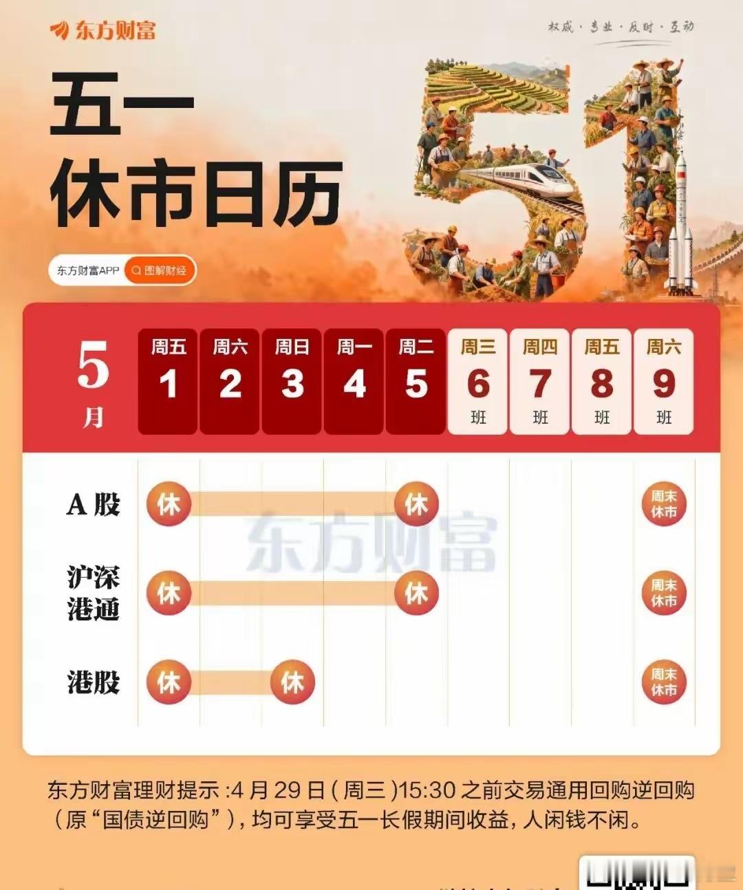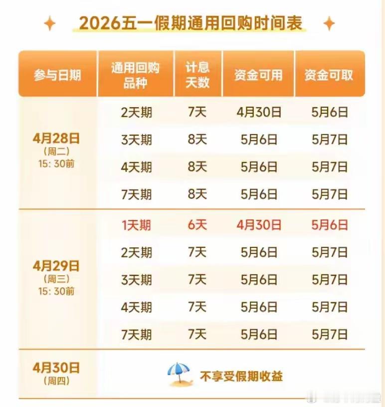 马上五一,这可是薅羊毛的好时机。4月28日15:30前交易3天期通用回购逆回购,能赚8天利息;4月29日15:30前交易1天期,可赚6天利息。通用回购核心规则没变,1000元起投,按年化收益率计息。