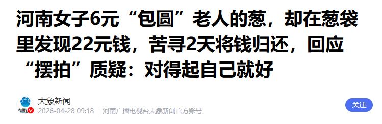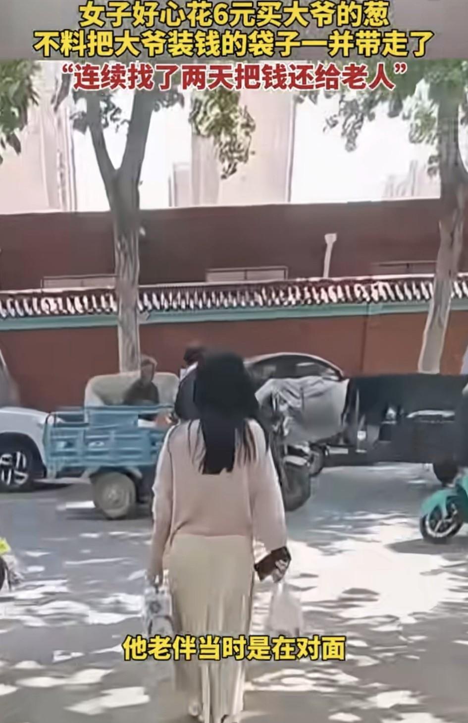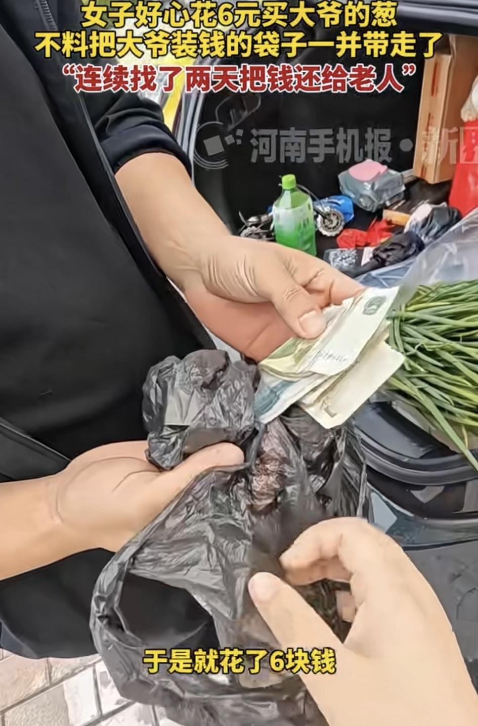 河南,一女子偶遇摆摊卖葱老人,见其生活拮据,花6元全包剩余小葱,回家后意外发现葱袋里藏着老人22元血汗钱,这钱是老人起早贪黑、风吹日晒挣来的全部家当,女子愧疚不已,连续两天穿梭在各个菜市场奔波寻人,终寻得老人归还钱款... 据悉,这位女子是在外出吃饭停车时,偶然看到了这位摆摊卖葱的老人。 彼时的老人,或是因为不让摆摊正要挪地方,或是大中午了还没卖完一根葱,蹲在路边,身影显得格外单薄。 女子看在眼里,疼在心里,她知道,摆摊卖菜的老人大多起早贪黑,收入微薄,挣的每一分钱都是风吹日晒换来的辛苦钱,日子过得十分拮据,大中午连一口热饭都吃不上。 出于怜悯,女子没有过多犹豫,掏出6元钱,将老人剩下的葱全部买了下来,那一刻,她因为做了一件小事而心生愉悦,简单道别后便提着葱回了家。 交易的过程十分简单,付款、拿菜、转身离开,双方没有过多交流,谁也没有察觉到,一场小小的意外,正在悄然发生。 老人在给女子装葱时,或是因为一边打理蔬菜、一边装菜,注意力太过分散,一时疏忽大意,误将自己的钱袋放进了葱袋;或是因为心疼女子花钱买了所有的葱,不愿亏欠对方,又怕当面还钱被拒绝,便假装说不卖,趁女子不注意,悄悄将钱袋藏进了葱袋里。 这个钱袋,裹着好几层塑料袋,里面装的不是什么巨款,全是一毛一块的零钱,一共22元,却是老人起早贪黑、一根葱一根葱挣来的全部家当,是他维持生计的希望。 女子回到家,准备整理买回来的葱时,意外摸到了葱袋里的异物,拆开一看,才发现了这个裹着多层塑料袋的钱袋。 那一刻,她没有丝毫意外的喜悦,反而涌上一阵止不住的着急和内疚。 她比谁都清楚,22元钱对年轻人来说,可能只是一杯奶茶、一瓶水的钱,随手就能花出去,但对靠摆摊卖葱为生的老人来说,这可能是他一上午甚至一整天的收入,是他和老伴的生活费。 想到老人发现钱丢后的焦急模样,女子没有丝毫犹豫,抓起钱袋就往买葱的地方赶,生怕走慢一步,老人就会走远,再也找不到。 可当她匆匆赶到当初遇到老人的地方时,原地只剩下老人摆葱用的化肥袋子,被风吹得贴在路边,老人早已不见踪影。 她拉住周边摆摊的摊主打听,才知道老人在她走后没多久,就发现钱丢了,当时翻遍了身上所有的口袋和三轮车的每一个角落,慌得不行,眼眶都红了,找了半个多小时也没有找到,最后只能蔫蔫地推着三轮车离开了,没人知道他住在哪里,也没人知道他以后还会不会来这里摆摊。 没有线索,没有联系方式,寻人变得格外艰难,但女子没有选择放弃,也没有想过将这笔钱私自留下。 接下来的两天里,她每天都专门抽出时间,往返于各个菜市场之间,在老人曾经摆摊的位置附近来回寻找、等候,逢人就描述老人的样貌和穿着,逐个摊位打听老人的下落。 菜市场人流量大,来往人员杂乱,寻找一位普通的摆摊老人,无疑是大海捞针,有摊主劝她,老人可能不会再来这个路口了,让她别再白费力气,但她始终没有动摇,心里只有一个念头:一定要找到老人,把钱亲手还给他。 功夫不负有心人,经过整整两天的奔波和等候,女子终于在另一个菜市场的角落,找到了那位卖葱的老人。 重逢的那一刻,老人依旧是那副单薄的模样,精神萎靡,低着头,连有人走到面前都没太察觉。 女子快步走过去,轻声喊住老人,拿出那个裹着多层塑料袋的钱袋,递到他面前。 老人抬起头,愣了几秒,才认出眼前的女子,当看到钱袋时,他的手瞬间抖了起来,反复摩挲着外面的塑料袋,一层层拆开,看到里面的零钱一分都没少,眼泪忍不住掉了下来,嘴里不停地道谢,声音哽咽着,说不出一句完整的话。 老人缓缓道出了钱袋出现在葱袋里的原因,或是因为女子全包了他的葱,他太高兴了,收拾时一时着急,忘了把藏在葱捆里的钱袋拿出来,又因为年纪大记性差,怕钱丢了,才特意用多层塑料袋裹好; 或是因为他心疼女子花钱买了所有的葱,不愿亏欠这份善意,又不好意思当面还钱,才故意将钱袋藏进葱袋里,把自己的全部家当用来还情。 女子归还钱款后,还特意给老人买了一箱牛奶和鸡蛋,表达自己无意中带走钱的歉意。 看着老人和闻讯赶来的老伴开心的模样,女子心里的内疚也终于烟消云散。 而老人,直到女子离开,还站在原地,不停朝着她离开的方向挥手道谢,脸上的笑容,是失而复得的喜悦,更是被善意温暖的感动。 22元钱不多,却承载着两个人最朴素的善意,这份双向奔赴的温暖,比任何巨款都要珍贵,也让我们看到,平凡人的善意,从来都能照亮彼此的生活。 信息来源: 大象新闻 2026年4月28日 《河南女子6元“包圆”老人的葱,却在葱袋里发现22元钱,苦寻2天将钱归还,回应“摆拍”质疑:对得起自己就好》