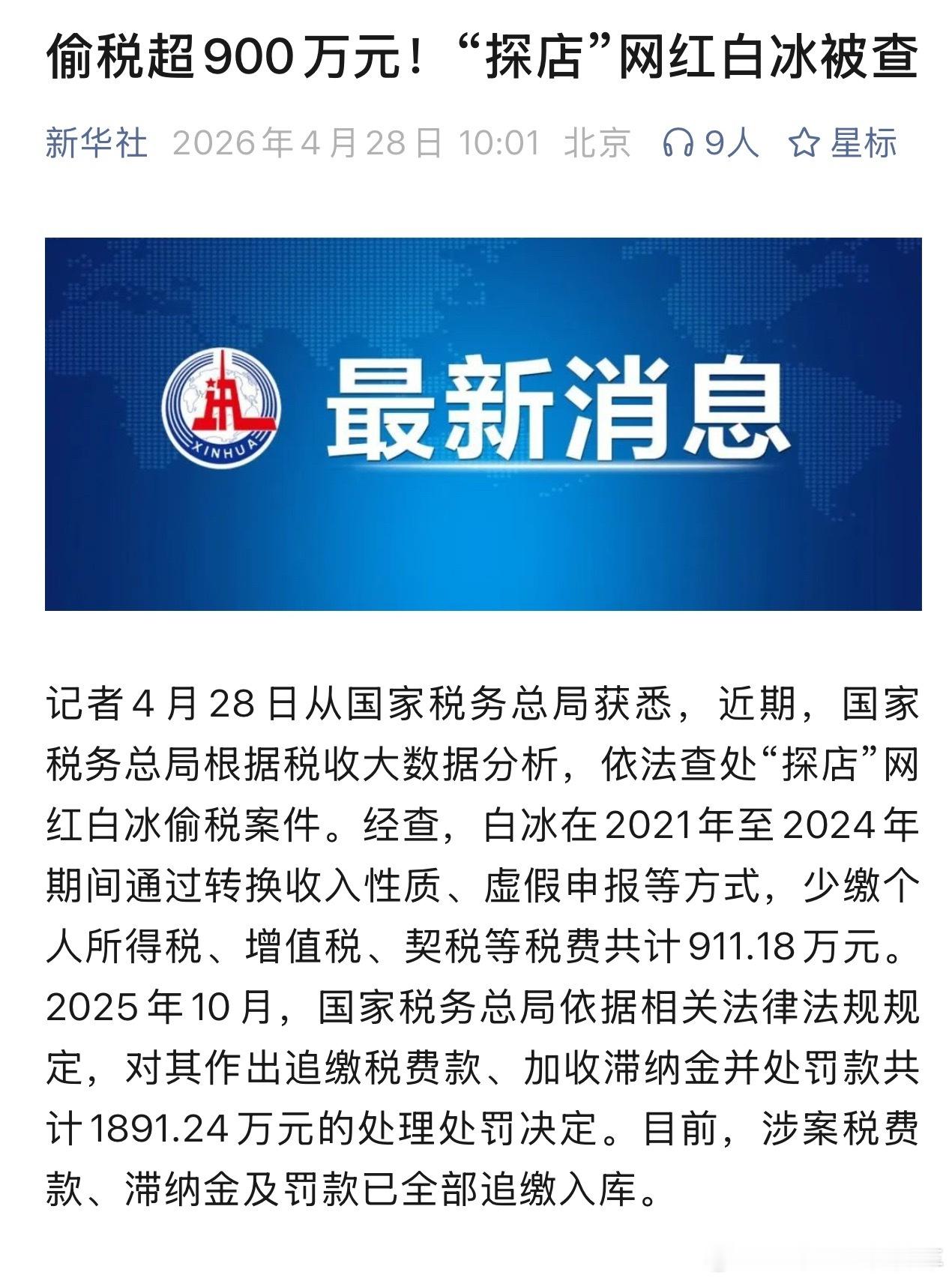 不过现在这件事也终告一段落了,2025年10月,国家税务总局依据相关法律法规规定,对其作出追缴税费款、加收滞纳金并处罚款共计1891.24万元的处理处罚决定。目前,涉案税费款、滞纳金及罚款已全部追缴入库。