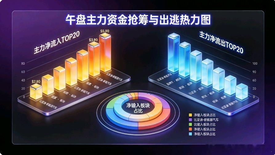 4月28日午盘主力抢筹与出逃一、主力净流入TOP20(抢筹榜)净流入总额:+105.21亿1. 中国长城(计算机设备):12.30亿2. 药明康德(医疗服务):10.92亿3. 工业富联(消费电子):10.60亿4. 中国船舶(航海装备):9.42亿5. 中信证券(证券):6.62亿6. 东方财富(证券):5.40亿7. 中微公司(半导体):5.38亿8. 兆易创新(半导体):5.04亿9. 盈峰环境(环保设备):4.57亿10. 德明利(半导体):4.56亿11. 中国巨石(玻璃玻纤):4.03亿12. 宏和科技(玻璃玻纤):3.31亿13. 剑桥科技(通信设备):3.20亿14. 汇绿生态(基础建设):3.03亿15. 宏景科技(IT服务):3.00亿16. 赤天化(农化制品):2.99亿17. 综艺股份(综合):2.85亿18. 华泰证券(证券):2.76亿19. 拓日新能(电力):2.62亿20. 海康威视(计算机设备):2.61亿 二、主力净流出TOP20(出逃榜)净流出总额:-147.57亿1. 中际旭创(通信设备):20.55亿2. 天孚通信(通信设备):12.12亿3. 立讯精密(消费电子):11.58亿4. 亨通光电(通信设备):10.19亿5. 拓维信息(软件开发):9.37亿6. 中天科技(通信设备):8.97亿7. 江波龙(半导体):7.28亿8. 永鼎股份(通信设备):7.01亿9. 澜起科技(半导体):6.04亿10. 天赐材料(电池):5.94亿11. 云南锗业(小金属):5.39亿12. 华胜天成(IT服务):5.23亿13. 蓝色光标(广告营销):5.14亿14. 宁德时代(电池):5.14亿15. 三花智控(家电零部件):4.83亿16. 合力泰(光学光电子):4.77亿17. 新易盛(通信设备):4.60亿18. 长芯博创(通信设备):4.54亿19. 永太科技(化学制品):4.51亿20. 兴森科技(元件):4.37亿 (数据不构成投资建议,投资有风险,入市需谨慎)
