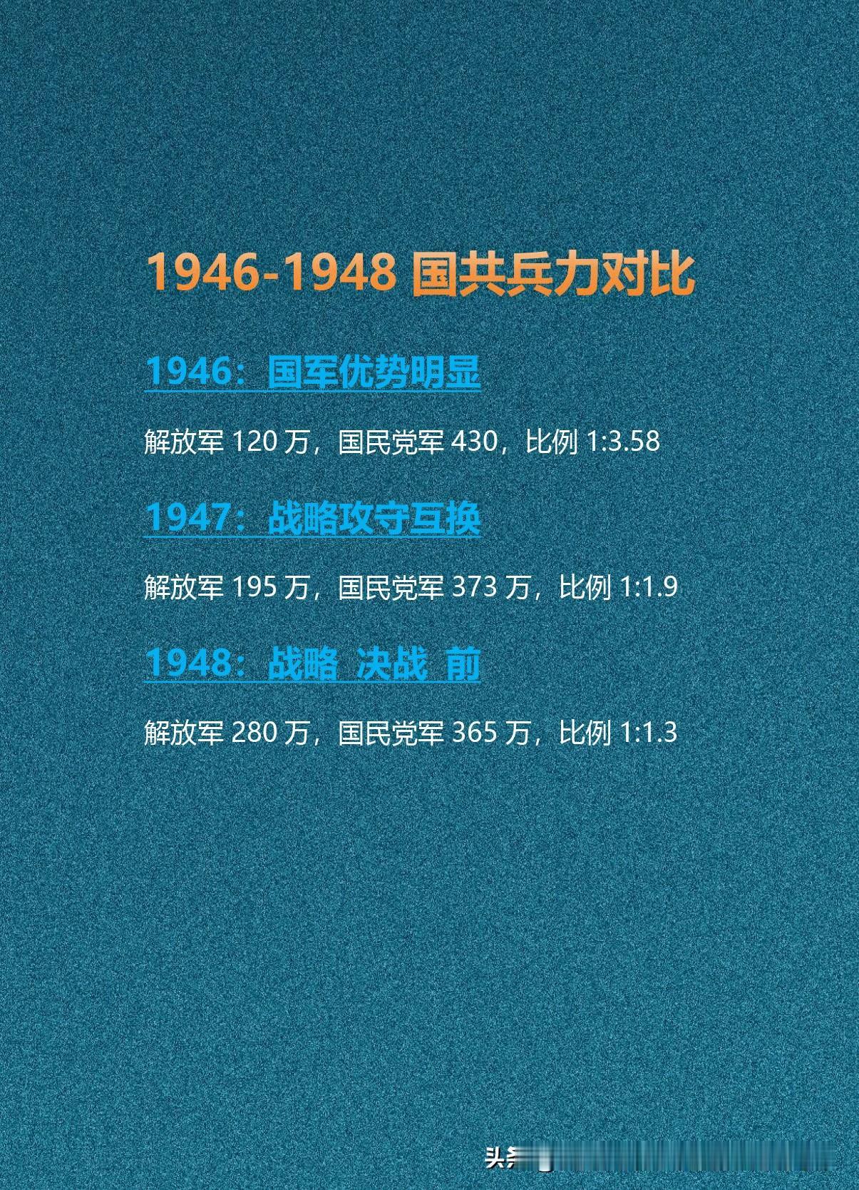 1946-1948国共兵力对比 1946年6月,国民党发动全面内战,历经两年,敌我双方兵力变化明显。解放军完成了由战略防御转入战略进攻,三大战役开始。