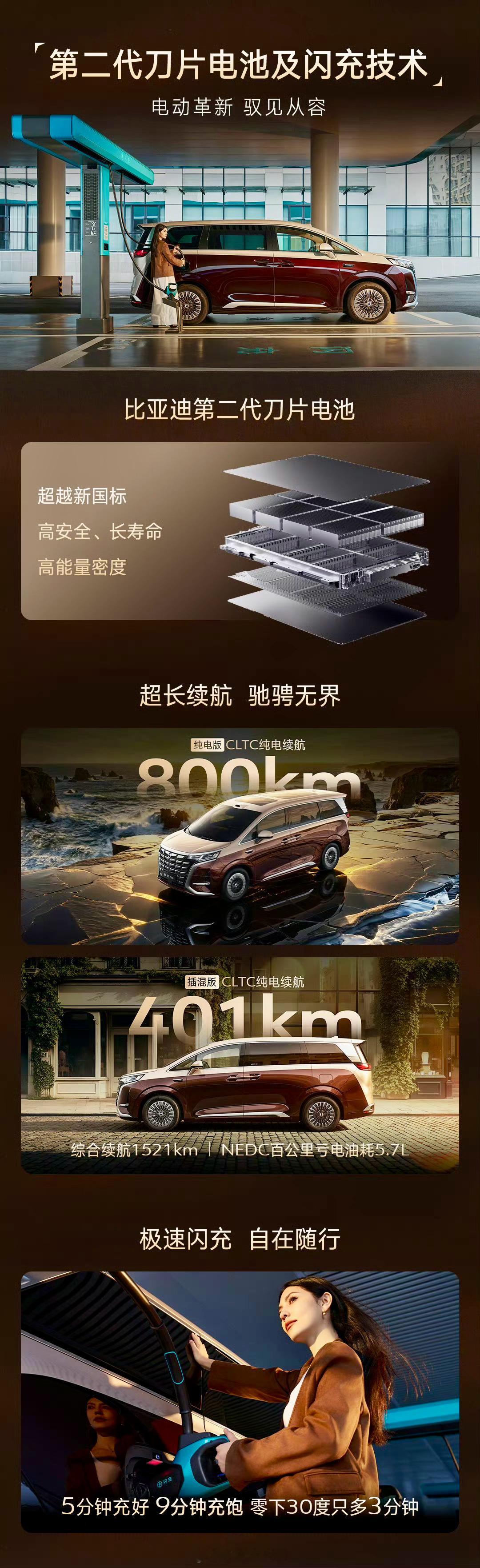 续航和充电上,插电混动款纯电能开401公里,纯电款能开800公里,两种动力加起来最远能跑1520公里。充电速度很快,5分钟就能把电量充到70%,9分钟就能充得差不多,就算是零下30度的极冷天气,充电也只多花几分钟。目前品牌有5500多个快充站,到年底会增加到2万个。