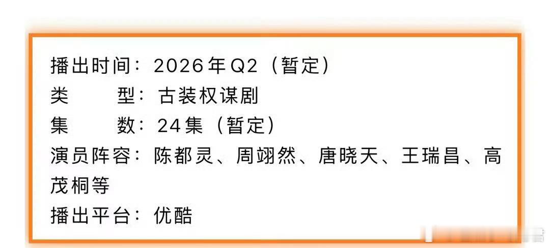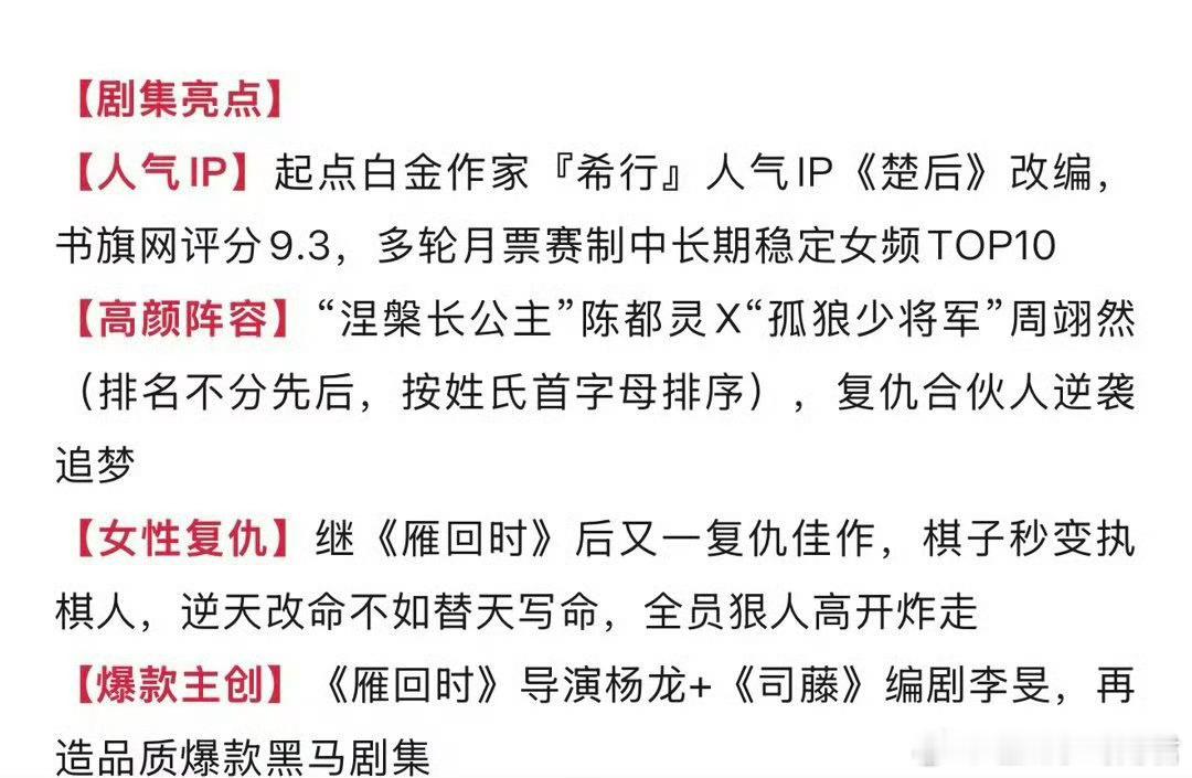 陈都灵、周翊然《翘楚》预计6月优酷开播。 【人气IP】起点白金作家『希行』人气IP《楚后》改编,书旗网评分9.3,多轮月票赛制中长期稳定女频TOP10【高颜阵容】“涅槃长公主”陈都灵X“孤狼少将军”周翊然(排名不分先后,按姓氏首字母排序),复仇合伙人逆袭追梦【爆款主创】《雁回时》导演杨龙+《司藤》编剧李旻,再造品质爆款黑马剧集