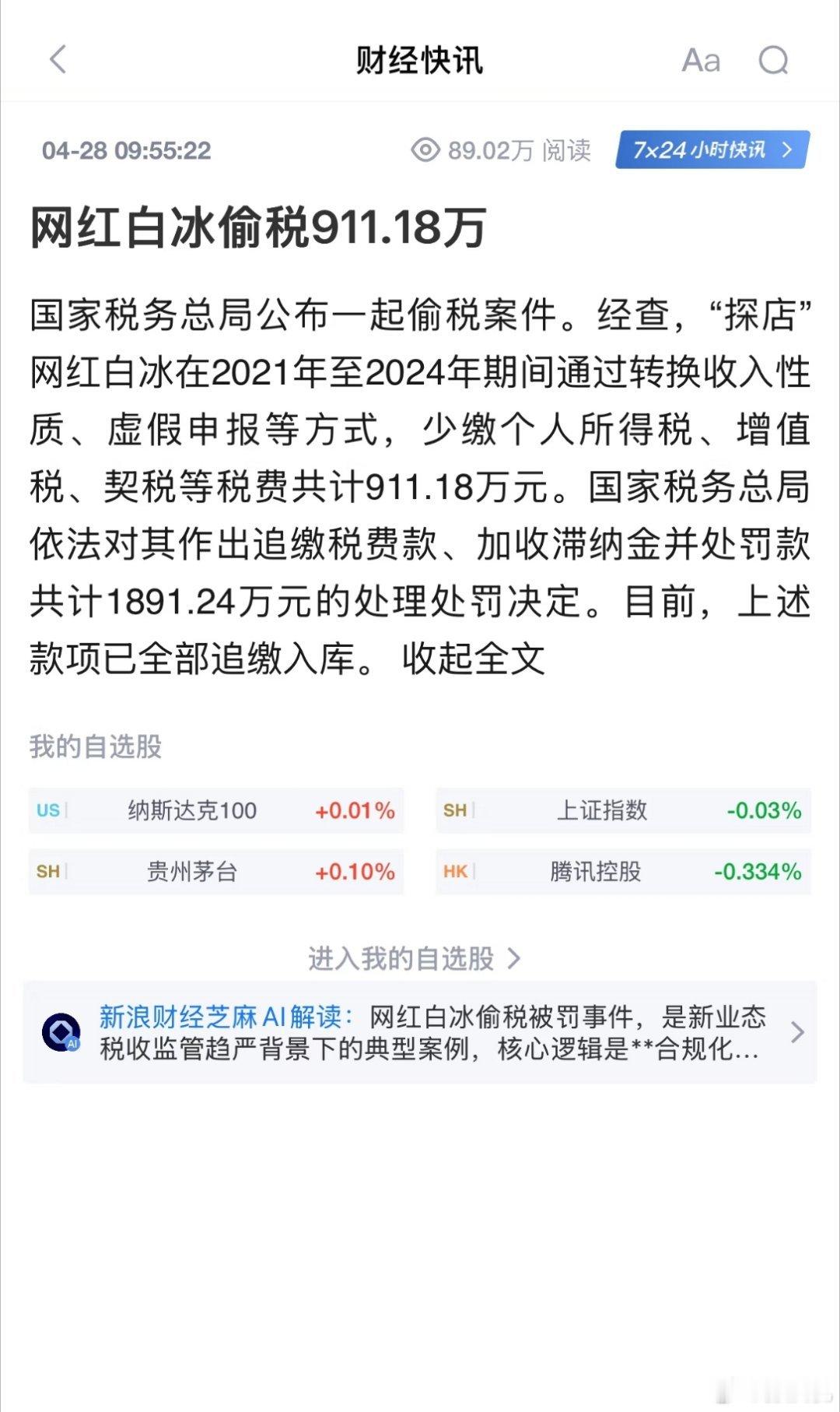 网红白冰偷税911.18万网红白冰偷税被查处!!税务部门依法查处“探店”网红白冰 偷税案件 税款、滞纳金、罚款1891万元已入库
