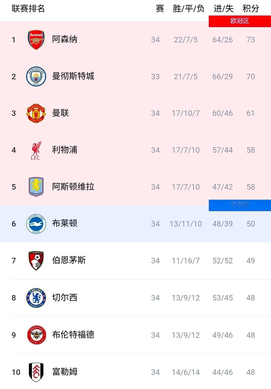 英超第34轮战罢,联赛大局逐步敲定,距离赛季结束仅剩四轮比拼。曼联在主场顺利拿下胜利,稳住自身联赛第三的位置。如今英超凭借顶尖联赛积分,稳定收获五个欧冠参赛资格,榜首双雄早早锁定名额。利物浦与维拉陷入同分拉锯,争夺欧冠席位主动权,切尔西战绩持续拉胯,彻底退出欧冠竞争行列,特殊规则下英超有望六队同台欧冠。