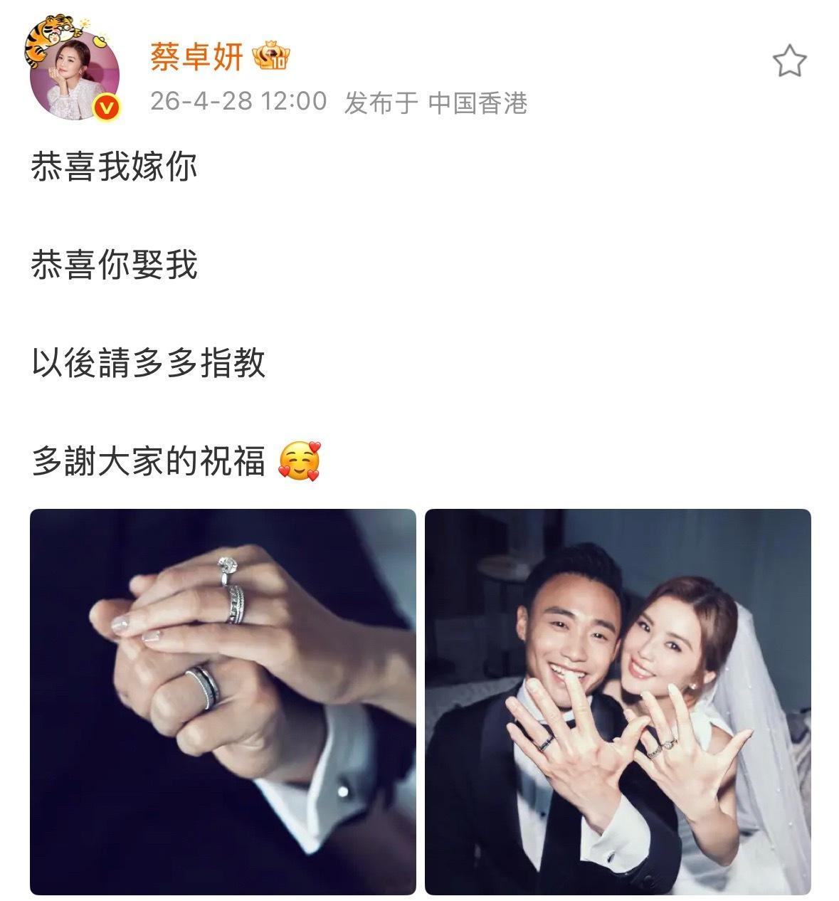 蔡卓妍晒婚纱照官宣结婚蔡卓妍晒婚纱照官宣结婚,我天,恭喜!