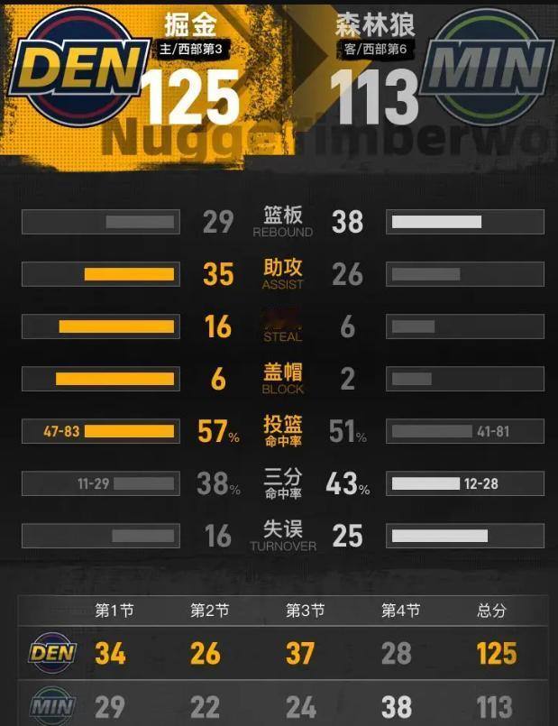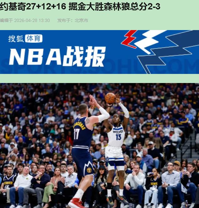 戈贝尔正负值-25,约基奇+18。谁告诉我,这俩人在场上打的是同一种运动? 2026年4月28日,掘金125比113,把大比分咬回2比3。森林狼少了爱德华兹、迪文琴佐,掘金也没了戈登。芬奇56岁,手里少两张王牌;阿德尔曼44岁,场边稳得像块石头。名义上是残阵互殴,实际上是冠军中锋的公开课。 逆喻就在这儿。戈贝尔,三届DPOY,33岁,上一场把约基奇锁到26中7。这场约老师15中9,27分12篮板16助攻,正负值全队第二。他不背身硬凿,拉到罚球线以上发牌,琼斯、约翰逊、默里,谁空谁投。戈贝尔腿沉得跟灌了铅,扑不出去,缩不回来。31岁的塞尔维亚胖子,把33岁的法国铁塔当风筝放了。 第三节7分34秒,24岁的斯宾塞·琼斯蹲在左侧底角,面前三米没人。戈贝尔被约基奇按在腰位,麦克丹尼尔斯追默里漏了个干净。琼斯抬手,刷,三分。下一回合,同样位置,同样姿势,又中。单节三记三分,分差从9分蹦到18分。这哪是二轮秀?这是掘金的隐藏副本。 森林狼末节轰了38分,追到10分。掘金领先27分差点翻船,布劳恩底角三分救命,默里抢断暴扣才把棺材板钉上。兰德尔27分9篮板6助攻,看着唬人,正负值-16。道苏姆G4爆砍43分,这场只剩18分。神奇这东西,一次性消耗品,用完就没了。 约基奇生涯季后赛第23次三双,历史第三。他不是在刷数据,他是在给全联盟写教案:想淘汰卫冕冠军,伤两个人,根本不够。掘金大胜森林狼总分2-3