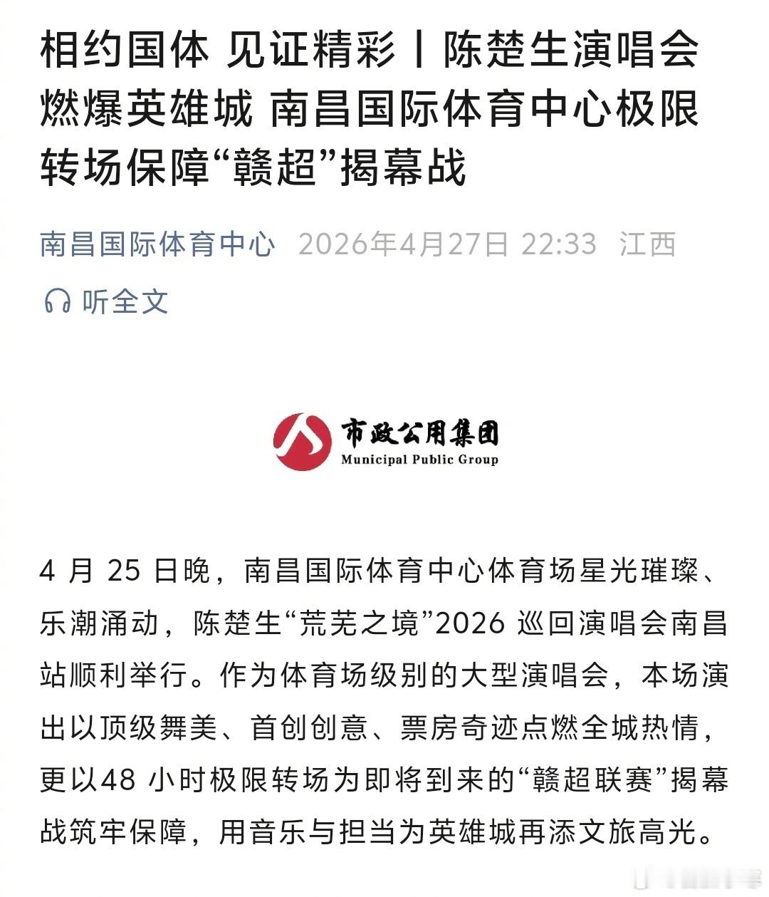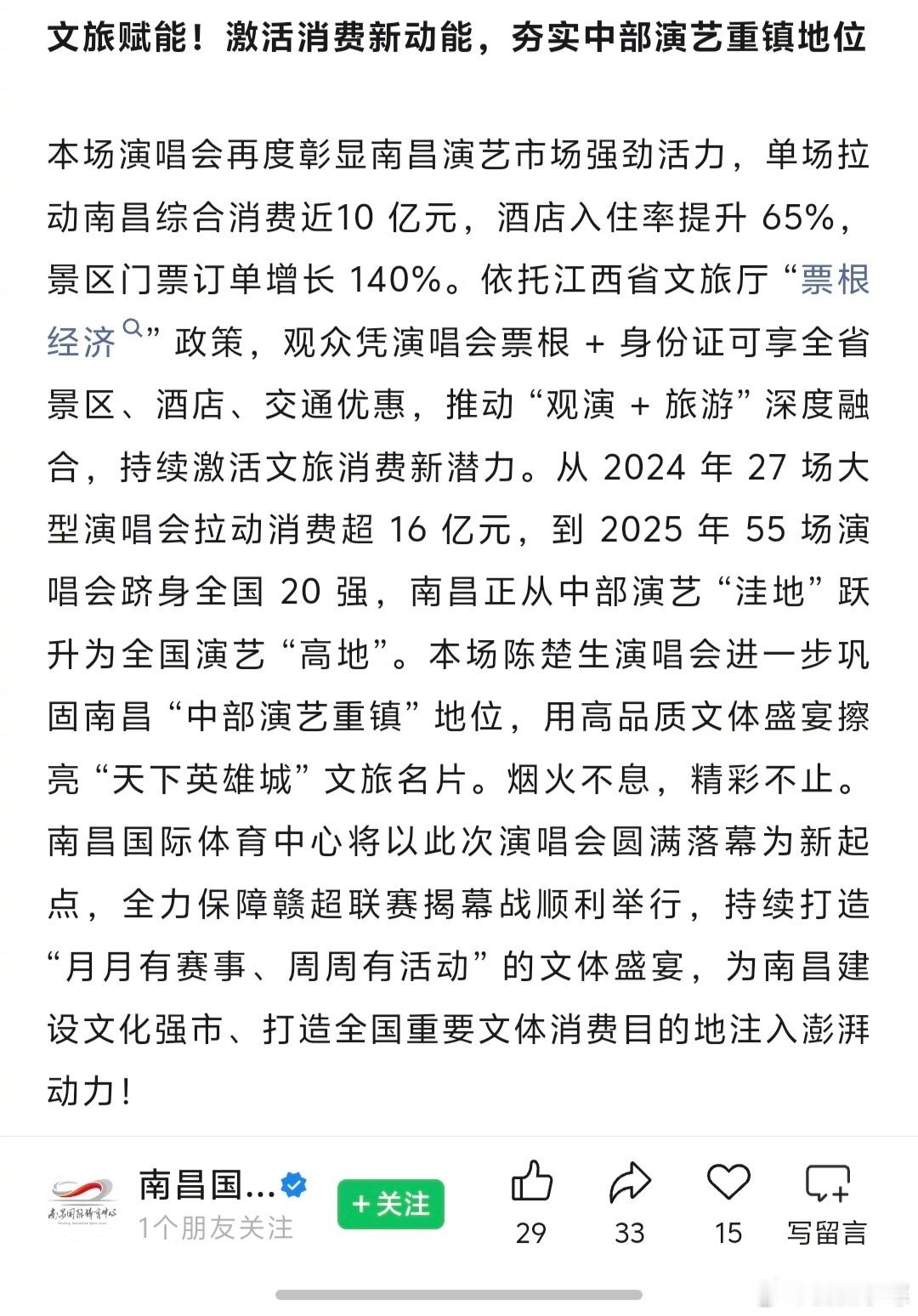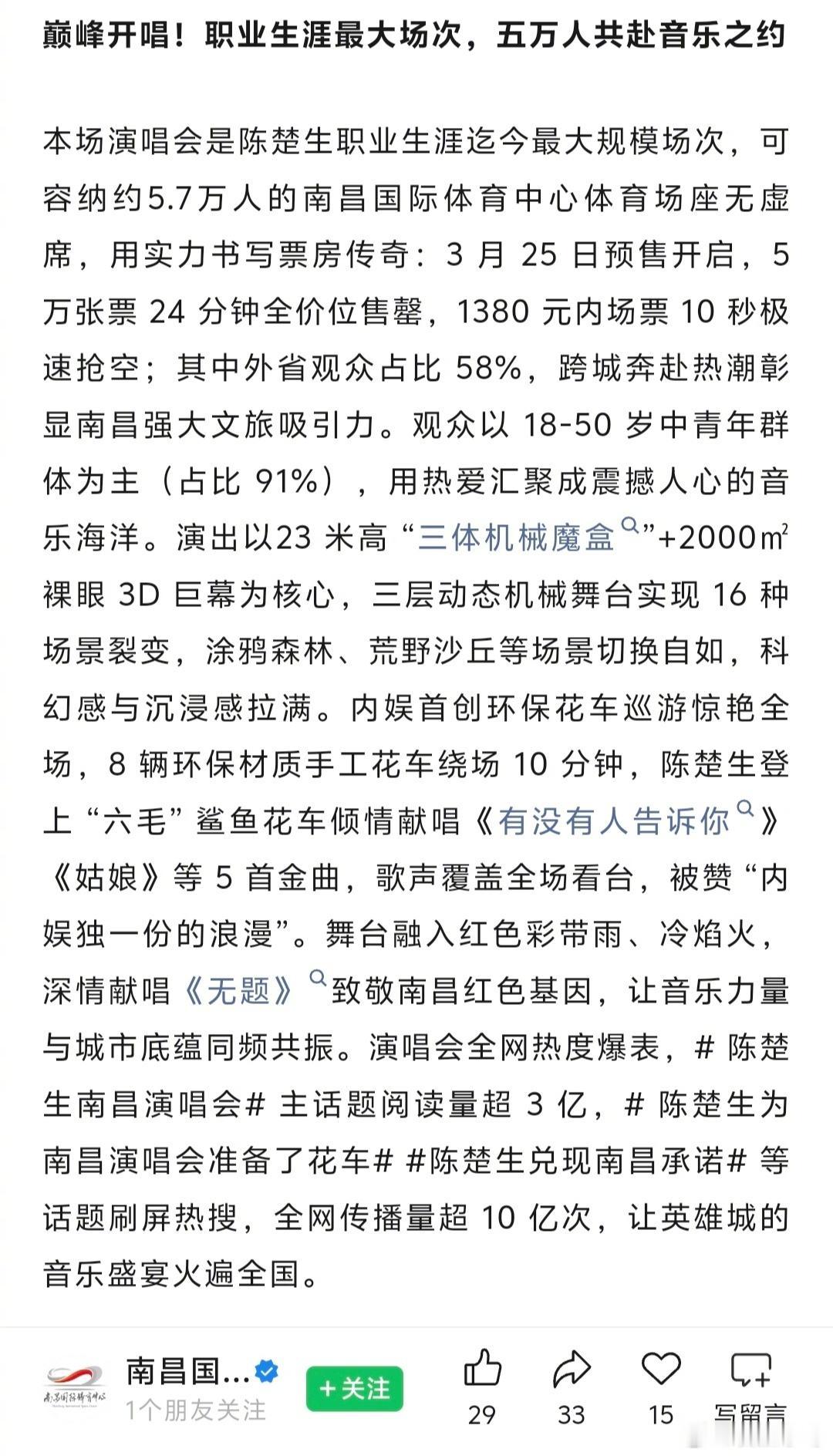 陈楚生单场演唱会带动消费10亿 陈楚生南昌站太绝了!顶级舞美沉浸式体验,环保花车巡游治愈又浪漫,《无题》致敬英雄城,细节里全是温柔与诚意。满场红海合唱,带动全城文旅爆发,单场拉动近10亿消费,这才是音乐的力量!