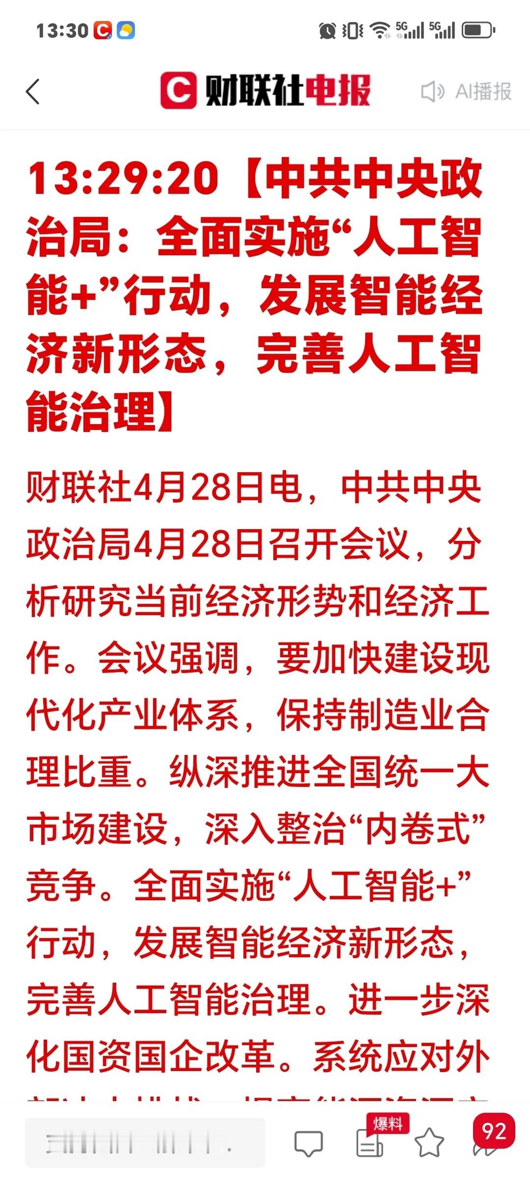 就在刚刚,高层重磅会议提出了,要全面实施“人工智能+”行动,这是实打实的国家级战略加码。人工智能将要全面覆盖大厂小厂,前途将是一片蓝海。这次会议核心就三件事:建现代化产业体系、整治内卷竞争、全力推AI+。说白了,就是给AI撑腰,让科技硬起来,淘汰低端内卷。全面落实人工智能化,提高生产效率。AI人工智能的好处多:帮制造业降本增效,统一大市场打破壁垒,AI治理护航行业健康发展,全是实打实的利好实体经济 。对A股来说,这是强政策利好。我的观点是:AI从概念炒作转向业绩兑现,资金会聚焦有技术、有落地的真龙头。