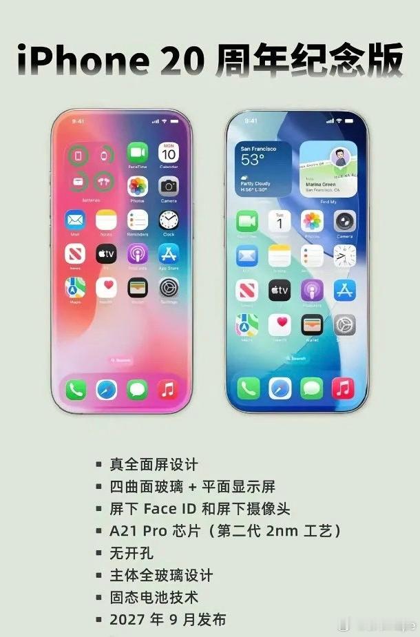 全面屏iPhone明年20周年 真的能拿出来吗?曝苹果将推出真全面屏手机 据说27年推出iPhone二十周年款将搭载屏下Face ID+隐藏前摄,取消灵动岛与屏幕开孔+四曲面微弧屏幕无孔全屏 这颜值和沉浸式体验简直完美极了国产旗舰好不容易直屏苹果开始玩四曲面数码闲聊站新品驾到苹果果粉