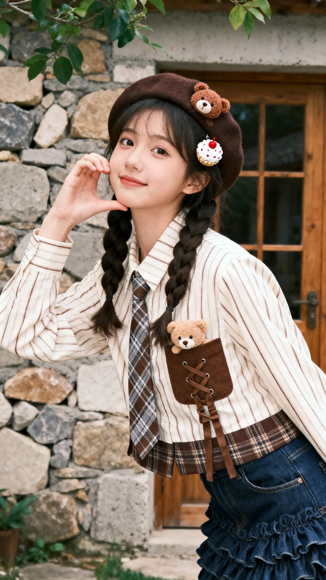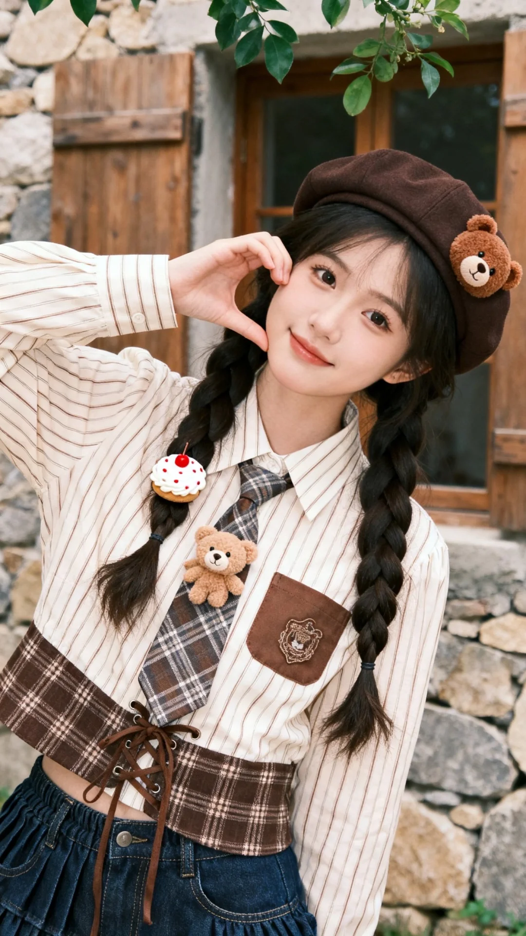 微距拍摄,聚焦一位年轻19岁的娇小女性,拥有冷白皮,面部线条柔和,是兼具网感的偶像脸风格;头发扎成双麻花辫,发丝蓬松,整体气质甜美又带点俏皮的少女感。佩戴深棕色贝雷帽,帽檐处别着小巧的棕色小熊装饰,左侧麻花辫旁还夹着一个奶油白色带红点的小心型造型发饰,细节感满满。穿米白色底搭配浅棕细条纹的长袖衬衫,衬衫领口系着棕灰格纹小领带,领带上别着毛绒小熊装饰;衬衫前胸袋有棕色系带设计,下摆拼接深棕色格纹布料,形成撞色层次感。搭配深蓝色牛仔下装,裤型有褶皱设计,风格休闲。女性身体微微侧向镜头,头部轻歪,右手抬起至脸颊旁,手指弯曲做出类似比心的半弧形手型,指尖轻触下巴位置,眼神直视镜头,姿态灵动又甜美。背景是一处带有石砌墙面和木质门窗的建筑,墙面由大小不一的石块与水泥拼接而成,风格质朴且带有复古感;上方有绿色植物枝叶点缀,整体场景营造出一种欧式乡村且复古庭院的氛围,画面色调柔和,氛围惬意