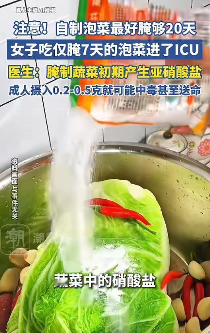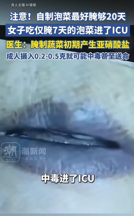 “悲剧还是发生了!”4月27日报道,福建,一女子自制泡菜,刚腌了7天,就迫不及待开封吃了起来,结果吃完不久,她就出现了头晕胸闷的症状,嘴唇和指甲盖还变成了蓝紫色,送医后被确诊为亚硝酸盐急性中毒,直接住进了ICU!网友:太心急了!】 迫不及待吞下一口泡菜,未曾想,这一时的急切竟将自己推向了健康的悬崖。一口泡菜的冲动,换来的是ICU病床上的挣扎,令人唏嘘。 4月27日,福建有一位大姐因突发状况被紧急送往医院。生命无常,愿大姐能在医护人员的悉心照料下转危为安,早日康复。医生给出的诊断让所有人倒吸一口凉气——急性亚硝酸盐中毒,嘴唇和指甲盖已经变成了骇人的蓝紫色。 这是何情况?不过是一罐自家腌制的泡菜罢了。 大姐对这口酸爽的馋念,早已不是一朝一夕之事。那股酸爽滋味,仿佛有着无形的魔力,在大姐心间萦绕许久,引得她心心念念。为了做出一罐称心如意的泡菜,她专门跑去菜市场精挑细选,确保每样菜都新鲜无腐烂、无损伤。回到家,按步骤认认真真做好,密封起来,大功告成。 此后,便是一段漫长的等待。时光仿若凝滞,每一分每一秒都在考验着耐心,那未知的结果如雾霭中的幻影,让人在寂静里默默期盼。大姐心里那根弦一直绷着,每天早上一睁眼,先走到罐子前闻一闻,看有没有淡淡的酸香味飘出来。傍晚下班归家,甫一踏入家门,便不由自主地移步凑上前去,投以好奇的目光,一探究竟。心中不住地思忖:究竟何时方能品尝到这亲手烹制的佳肴呢?那美味仿佛已在舌尖萦绕,引得满心期待。 第七天到了。大姐又走到玻璃罐前,那股子诱人的味道直接把馋虫勾了起来。心里嘀咕:都腌了一个星期了,应该能吃了吧?反正都是自己亲手做的,就算没完全发好,应该也没啥大问题…… 越想越馋,实在忍不住了。开封,夹菜,配饭,吃了不少。 谁曾料到,那珍馐美馔入腹未几,人便渐觉不适,种种异样悄然浮现,令人始料未及。顷刻间,一阵眩晕感袭来,头部昏沉如坠云雾。胸口亦似被巨石紧压,烦闷不堪。呼吸也变得急促起来,好似每一次吸气都用尽了全身力气。大姐思忖着,许是方才进食过快且食物过咸所致,赶忙斟了一杯温水,一饮而下,试图借此缓解不适。 结果不但没好转,反而越来越严重——手脚开始发麻,浑身酸软无力,连站都站不稳了! 家里人围过来一看,所有人都吓坏了:嘴唇竟然慢慢变成了蓝紫色,手指、脚趾的指甲盖也都渐渐染上了这种吓人的颜色。二话不说,赶紧找车,一路狂奔送到医院。 经一番细致检查,大姐被诊断为急性亚硝酸盐中毒。此病症来势汹汹,亟待及时治疗,以缓解大姐的痛苦,保障其身体健康。直接被推进ICU抢救。 紫绀,此乃亚硝酸盐中毒最为典型之表现。它宛如中毒症状里的鲜明标识,清晰地揭示着亚硝酸盐在人体引发的危害。亚硝酸盐这家伙会劫持血红蛋白,让全身组织缺氧,嘴唇和指甲盖就是最直观的外在信号。 问题随之而来:原本状态良好的蔬菜,何以经过腌制这一过程,竟摇身一变成为“毒药”? 新鲜蔬菜天然富含硝酸盐,此乃蔬菜生长时自然生成之物。它对人体并无危害,日常食用新鲜蔬菜,大可不必为此忧心。 然而,一旦将其用于腌制,情形便截然不同。原本普通的食材,在腌制的魔法下,仿佛被赋予了全新的灵魂,焕发出别样的风味。泡菜在腌制过程中,蔬菜表面会附着一些天然细菌,比如植物乳杆菌、食窦魏斯氏菌等。在密封且缺氧的环境中,这些细菌会进行代谢反应,将蔬菜自身所含的无害硝酸盐,逐步转化为有毒的亚硝酸盐。 关键来了:这个转化过程不是一条直线,而是遵循“先升后降”的规律,就像一条抛物线一样,有一个明显的最高点。腌制头几天,亚硝酸盐含量会随着细菌活动不断增加,等腌到7到14天的时候,亚硝酸盐含量就会达到峰值。这个阶段,恰恰是泡菜最危险、绝对不能吃的时候! 不同品类的蔬菜,在腌制过程中,亚硝酸盐峰值的出现时间存在差异。有的可能五六天就冲到最高,有的会稍晚一点,但总体来说,7到14天都是亚硝酸盐的高危期。 一旦吃完感觉身体不舒服,或者发现嘴唇指甲发紫,别犹豫,立刻去医院。千万别在家自己灌水硬扛,那玩意儿靠喝水是解不了的。 这不仅是她一个人的失误,更是传统经验与现代食品安全认知之间那道看不见的鸿沟。多少代人传下来的习惯是“腌几天就能吃”,可科学告诉我们,那个“安全”的时间点,远比我们想象的要晚。 下一个打开泡菜罐的人,会多等几天吗? (信息来源:潮新闻《自制泡菜最好腌够20天!女子吃仅腌7天的泡菜,中毒进了ICU。医生:腌制蔬菜初期产生亚硝酸盐,成人摄入0.2-0.5克就可能中毒甚至送命。自制泡菜最好腌够20天!》)