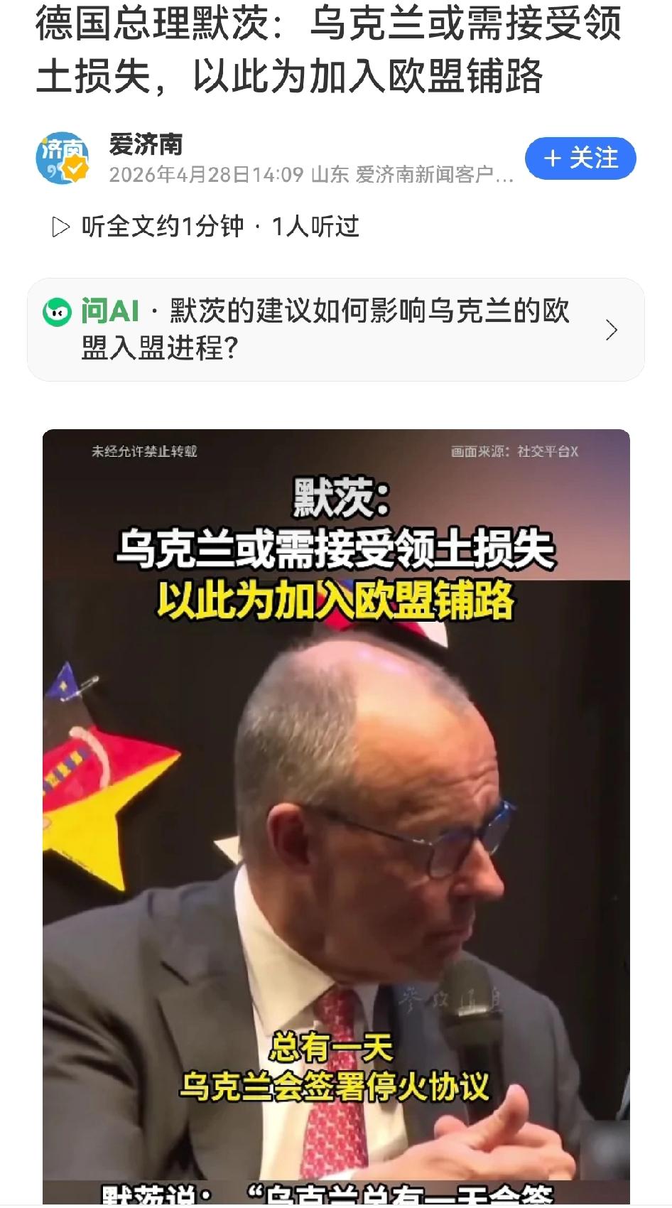 德国总理默茨表示,乌克兰未来与俄罗斯达成和平协议时,可能不得不接受部分领土不再属于乌克兰的现实。默茨将这种领土让步与乌克兰加入欧盟的前景直接挂钩,称泽连斯基若要推动此类决定,可对民众说“我为你们打开了通往欧洲的道路”,并建议就领土问题和入盟事宜举行“平行公投”。他同时暗示泽连斯基提出的2027年入盟时间表“行不通”,认为乌克兰需通过“中间步骤”逐步融入欧盟体系。目前约20%的乌克兰领土处于俄罗斯控制之下。 默茨这番话,听着像在给乌克兰指条“光明大道”,细品却满是欧洲式的精明算计。一边高喊支持乌克兰主权完整,一边却把国土当入盟的“入门费”,这算盘打得基辅都能听见。 有趣的是,默茨还贴心为泽连斯基准备了演讲稿,仿佛忘了是谁在前线浴血奋战,是谁的国土在炮火中呻吟。欧盟一直标榜“主权平等”,如今却要乌克兰用土地换门票,这“欧洲价值观”的含金量,怕是要按平方公里计价了。 更讽刺的是,德国曾是二战后领土调整的亲历者,如今却成了“割地建议”的提出者。当和平需要用主权来交易,当入盟需要用国土来买单,这样的欧洲大家庭,究竟是乌克兰的避风港,还是新的枷锁?牺牲的乌军士兵,该如何理解用领土换欧洲的“伟大”?
