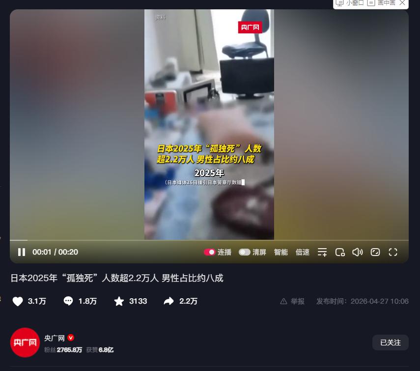 刚看到日本警察厅最新发布的2025年官方统计数据,一组数字直接撕开了这个发达国家最冰冷、最残酷的真面目。 央广网4月27日发布,2025年一整年,日本有76941名独居者在家中离世,其中22222人死后超过8天才被发现,被日本官方依据《孤独和孤立对策推进法》正式认定为孤独死。 更扎心的是,这些悄无声息离开的人里,65岁以上的老年人占了整整七成,男性更是占到了惊人的八成,甚至还有208人,在死后超过一年才被外界察觉,彻底活成了社会的透明人。 这根本不是意外,而是日本整个社会体系全面崩塌的必然结果,是这个所谓高福利发达国家,亲手酿出来的无解死局。 日本的孤独死,本质上就是整个社会对底层个体的系统性抛弃,是一场持续了几十年的、温水煮青蛙式的社会溃败,现在终于到了集中爆发的节点。 这件事从来都不是某个人的人生选择出了错,而是整个社会的运行逻辑出了根本性的问题,当一个社会里,个体活着无人关心,死去无人知晓,那它所谓的发达和文明,早就只剩了一层空壳。 男性占到孤独死群体的八成,这件事一点都不意外,这就是日本传统社会结构和终身雇佣制,给这代男性挖的最深的坑。 这代日本男性,一辈子都被绑在企业的战车上,活着的所有价值都绑定在工作上,年轻时除了上班干活,没学会任何生活技能,没建立起工作之外的社交圈子,没经营好家庭的情感联结,一辈子活成了公司的工具人。 一旦退休、丧偶,或者被企业抛弃,他们就瞬间从社会的中坚力量,变成了没有任何社会联结的边缘人,别说主动寻求帮助,他们连开口跟人正常打交道的能力,都在几十年的职场规训里彻底丧失了。 65岁以上老人占七成,更是直接戳破了日本养老体系的谎言。所谓的高福利养老,在少子老龄化的绝对现实面前,就是一张彻头彻尾的废纸。现在日本65岁以上人口占比已经接近三成,独居老人数量突破600万,而且这个数字还在疯狂上涨。 年轻人不结婚、不生子,连自己都养活不起,根本没能力赡养老人,传统的家庭养老模式早就彻底破产了。 而公立养老院一床难求,私立养老院费用高得离谱,绝大多数普通老人根本负担不起,最终只能困在自己的小房子里,活着的时候就已经被社会彻底遗忘,死了之后自然没人知晓。 死后超过8天才被发现,甚至有人离世一年都无人察觉,背后是日本整个社会人际关系的全面瓦解,是“无缘社会”最真实的写照。 几十年的城市化进程,早就把日本传统的邻里羁绊磨得一干二净,公寓楼里门对门住十几年,互相不知道姓名是常态,别说关心邻居的死活,就算闻到异味,也只会关紧门窗假装没听见。 血缘关系越来越淡,子女跟父母常年不联系,地缘关系彻底消失,邻里之间老死不相往来,社缘关系全面断裂,退休就等于失去了所有社会联系,一个人活成了一座孤岛,就算这座岛沉没了,也不会在社会上激起半点涟漪。 更可怕的是,日本的孤独死危机,根本没有任何逆转的可能。日本政府2024年就出台了专门的法律,搞了一堆所谓的帮扶政策,结果2025年的孤独死人数照样不降反增,这就说明,靠修修补补的政策,根本解决不了结构性的社会绝症。 经济停滞三十年,年轻人看不到希望,低欲望情绪全面蔓延,不婚不育成了主流,家庭这个社会最基本的单元正在快速解体,人口结构持续恶化,独居群体只会越来越庞大,孤独死的数字也只会一年比一年触目惊心。 别觉得日本的孤独死离我们很远,这是所有进入老龄化社会的国家,都要面对的终极命题。 日本用几十年的时间,给我们踩了一个最惨痛的坑,它清清楚楚地告诉我们,一个社会如果只追求经济发展,忽略了人和人之间最基本的情感联结,就算经济再发达,福利制度再完善,也挡不住个体被社会抛弃的命运。 所谓的老有所养,从来都不是靠冰冷的制度和数字就能实现的,它靠的是人和人之间的羁绊,是家庭的温暖,是社会的善意。日本今天的困境,就是给所有东亚国家敲响的最刺耳的警钟。