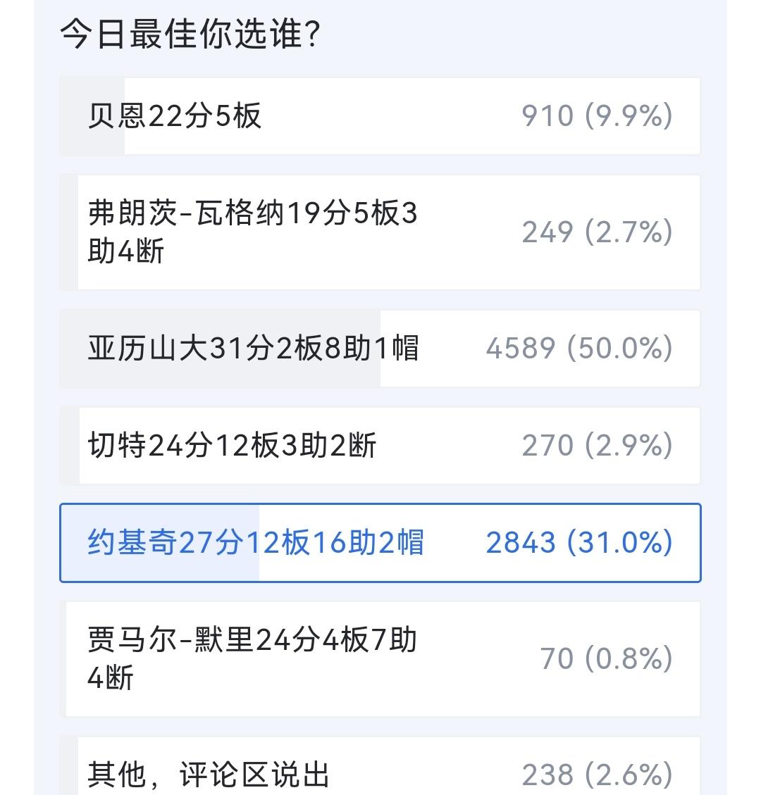 约基奇再次打出逆天数据,全场砍下27+12+16+2,但无缘今日最佳球员。 今天上午进行的三场比赛全部结束,其中魔术胜活塞,大比分3-1领先的他们有望拿到历史上第七次黑八奇迹。除此以外雷霆战胜太阳,以4-0的比分晋级到季后赛第二轮。当然最引人关注的肯定是掘金主场迎战森林狼。 本场比赛,森林狼头号球星爱德华兹和迪文岑佐缺席。上半场狼队打的不错,掘金领先优势没有突破十位数。第三节风云突变,掘金单节打出37-24净胜对手13分,从而125-113拿到第五场比赛的胜利。 同森林狼的比赛,约基奇依然是球队获胜的头号功臣。他15投9中,罚球10中8,砍下全场最高的27分外加12篮板16助攻的三双数据。 按理说,球队赢球,打出逆天数据的约老师应该拿下今日最佳球员。但是投票中,他仅排名第二位,带领雷霆横扫太阳的亚历山大当选今日最佳球员的殊荣。 客战太阳,亚历山大17中10,罚球11中9,拿到31分2篮板8助攻。投票来看,鸭梨获得了50%的选票。而约基奇只有31%,票数为2843张。 实话实说,单论数据,约基奇的肯定要比亚历山大好很多。但是约老师依然没有受到球迷的垂青,显然球迷们肯定是对他有偏见。我的投票给了约基奇,因为这数据不能不说漂亮。