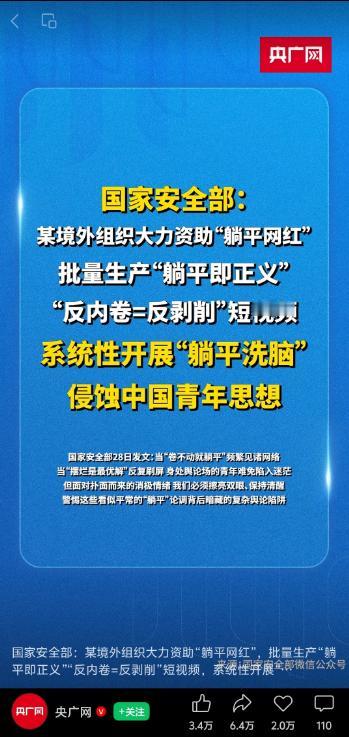 太猖狂了! 国安部发文,境外势力借“躺平”毒害青少年 境外势力专门砸钱扶持躺平网红,还系统性搞躺平洗脑毒害咱们青少年,2026 年 4 月 28 日国家安全部直接发文通报,狠狠戳破他们渲染努力无用、奋斗吃亏的鬼话,就是要消解我国青年的奋斗信念,甚至动摇咱们社会的价值根基! 这哪是劝人放松,分明是往青少年脑子里灌毒! 你刷短视频时是不是总刷到 “努力没用”“奋斗吃亏”?以前以为就是年轻人吐槽,现在才知道背后全是境外势力的黑手,他们批量造这种毒视频,就是要让咱们的孩子失去斗志! 这些境外组织真的坏到骨子里了,一边自己在全球疯狂 “内卷” 抢资源,一边却教咱们的青年 “躺平摆烂”,说什么 “躺平即正义”“反内卷 = 反剥削”,这逻辑简直狗屁不通! 国安部说得明明白白,他们不是随便搞搞,是有组织、有预谋、有策划的行动,目标就是消解中国青年的奋斗信念,甚至动摇咱们社会的价值根基,这用心何其歹毒! 我身边就有孩子被这种言论带偏的,本来学习挺努力,看了几个 “躺平网红” 的视频后,就开始上课走神、作业拖拉,说 “反正努力也没用,不如早点躺平”,家长急得直掉眼泪! 更让人恶心的是,这些 “躺平网红” 拿了境外的钱,就昧着良心忽悠自己人,把个体的暂时困境说成是整个社会的问题,还故意制造群体对立,真是丢尽了中国人的脸! 短视频平台上带 “躺平” 标签的视频,播放量高达几十亿次,意味着上亿青少年都可能看过这些毒鸡汤! 这些境外组织不光资助网红,还勾结一些不良媒体和智库,炮制 “奋斗 = 被剥削”“阶层固化 = 努力无用” 等歪理邪说,把好好的价值观搅得一团糟,简直是文化侵略! 你以为他们就这点手段?太天真了!他们还会针对不同年龄段的青少年定制不同的 “洗脑套餐”,对中学生说 “读书无用”,对大学生说 “考研没用”,对职场新人说 “升职无望”。 这些境外组织的头目自己一个个都是 “卷王”,住着豪宅开着豪车,却教咱们的孩子 “躺平摆烂”,这不是典型的 “只许州官放火,不许百姓点灯” 吗? 国家安全机关早就盯上这些歪风邪气了,这次发文就是要撕破他们的伪装,告诉所有人:“躺平” 不是什么时尚潮流,而是境外势力用来毒害青少年的精神鸦片! 中国能有今天的发展,靠的就是一代又一代人的艰苦奋斗,从 “两弹一星” 到 “嫦娥探月”,从脱贫攻坚到乡村振兴,哪一项成就不是奋斗出来的?哪能说躺就躺? 我就想问问那些 “躺平网红”,你们拿着境外的钱忽悠年轻人的时候,有没有想过自己的父母也是奋斗过来的?有没有想过如果人人都躺平,咱们的国家还怎么发展? 有些年轻人可能会说,我就是压力大想放松一下,又不是真的要躺平。但你知道吗?这种消极言论听多了,就会慢慢侵蚀你的斗志,让你从 “想放松” 变成 “真躺平”。 一定要擦亮眼睛,别被这些歪理邪说带偏。奋斗可能会遇到挫折,但绝对不是无用功;暂时的困难不是躺平的理由,而是努力的动力! 那些境外组织也别太得意,中国青年的奋斗精神不是你们几句歪话就能消解的。年轻人聪明着呢,你们的阴谋诡计迟早会被彻底揭穿,最后只能搬起石头砸自己的脚! 只要团结一心,抵制这些消极言论,弘扬奋斗精神,就一定能让境外势力的阴谋破产,让咱们的青少年都能健康成长,成为有理想、有本领、有担当的新时代青年! 要时刻警惕境外势力的文化渗透,别让 “躺平” 毁了自己,毁了下一代,毁了咱们国家的未来! 中国的未来掌握在奋斗者手里,不是躺在家里的 “躺平族” 手里。让那些想搞破坏的境外势力看看,中国青年永远不会被他们打垮! (每天更新,欢迎关注,喜欢文章的可以帮忙点个赞留条评~) 对此大家有什么看法?