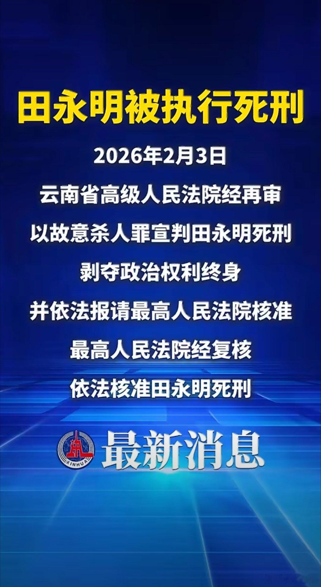 强奸出狱后杀人男子被执行死刑4月28日,云南玉溪中院遵照最高法命令,对累犯田永明依法执行死刑,当地检察院全程临场监督。据悉,田永明曾因强奸获刑,出狱后恶性不改,再度犯下故意杀人重罪。案件经再审审理,其被判处死刑、剥夺政治权利终身,后经最高法复核核准。罪大恶极,法理难容。此案彰显司法严惩恶性暴力犯罪、维护社会安全与公平正义的坚定决心。强奸出狱后又杀人男子被执行死刑