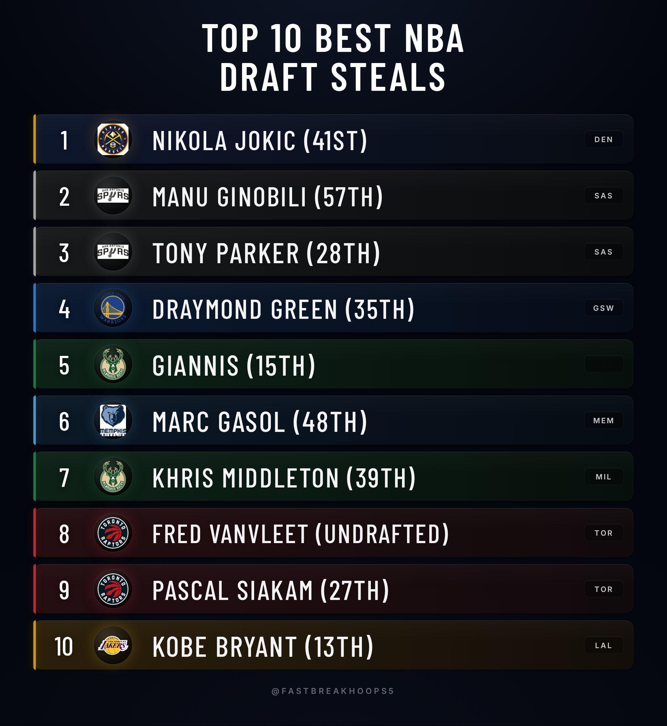 美自媒体评选的NBA选秀历史上的10个最大捡漏,约基奇第一,吉诺比利和帕克第二第三!nba季后赛全民点评家NBA