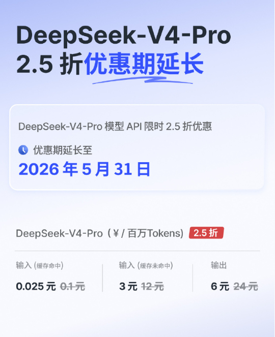 DeepSeek V4的token价格继续把价格战打下去,2.5折的活动日期再次延长,之前是从5月5日延长到5月31。 还是国产算力把价格打了下来~AI商业