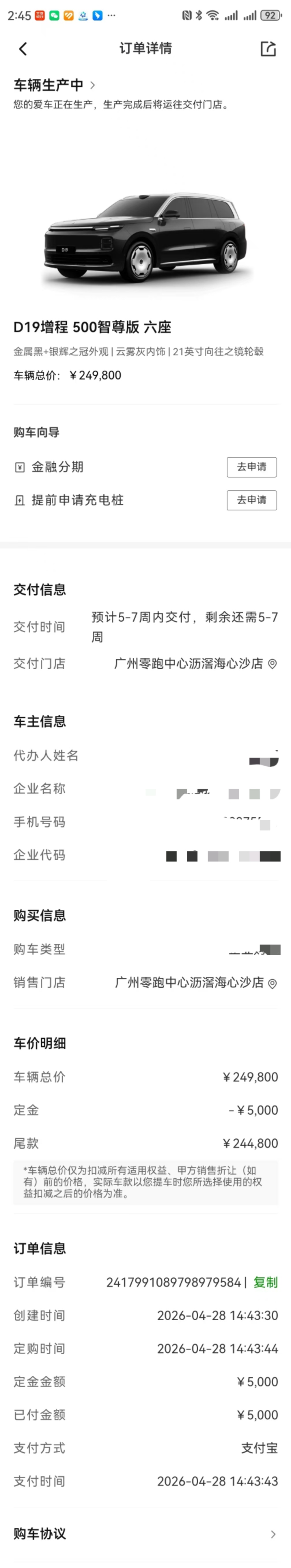 零跑D19下单了下单的配置是增程500智尊版 六座车价24.98万就说零跑这个车子好卖,居然要等5-7周很火爆有木有零跑d19零跑