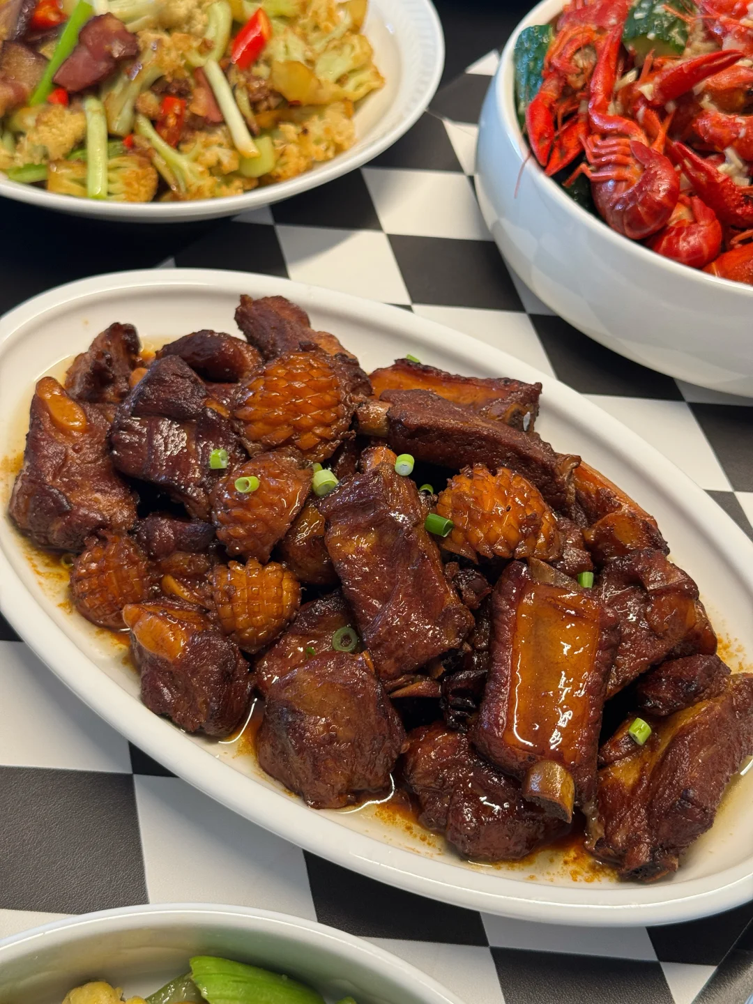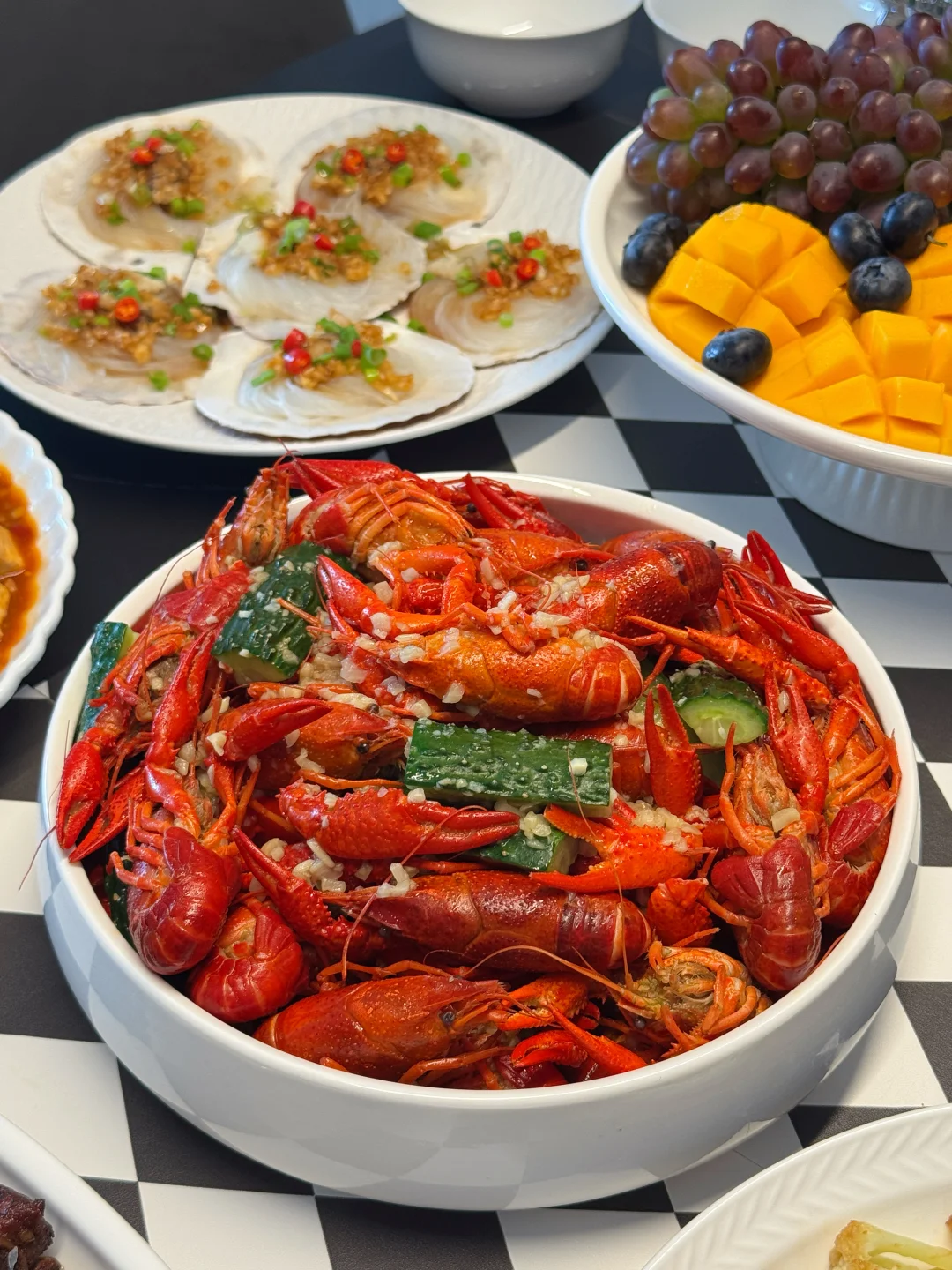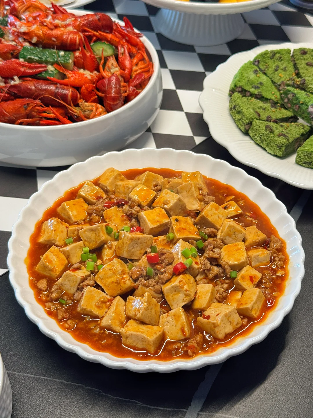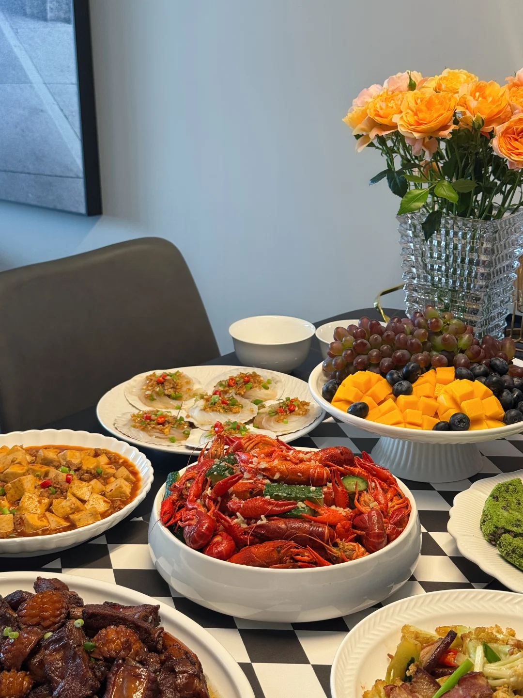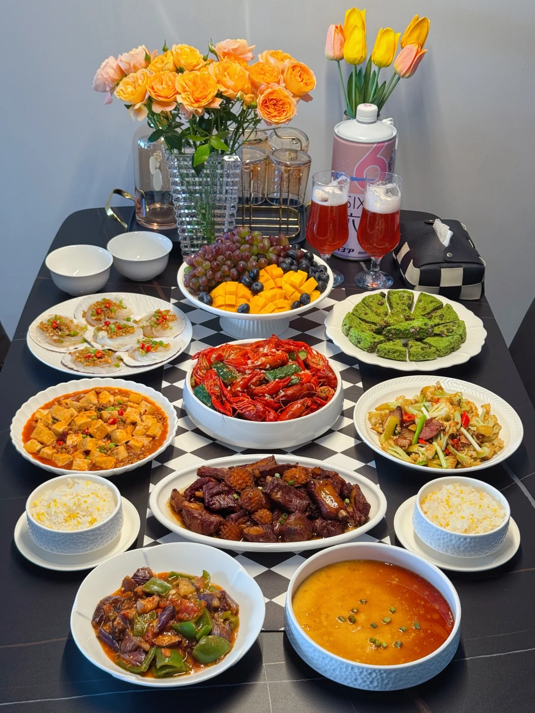 精心筹备一场家宴就是我跟朋友之间最走心的仪式感。临近五一小长假,赶在大家出去玩之前,亲手张罗一桌饭菜聚一次~ 提前祝大家假期愉快~ 菜单🥢 [庆祝R]蒜香小龙虾 [庆祝R]红烧鲍鱼排骨 [庆祝R]蒸鸡蛋羹 [庆祝R]干锅菜花 [庆祝R]麻婆豆腐 [庆祝R]家常烧茄子 [庆祝R]蒜蓉粉丝扇贝 [庆祝R]红豆青糕